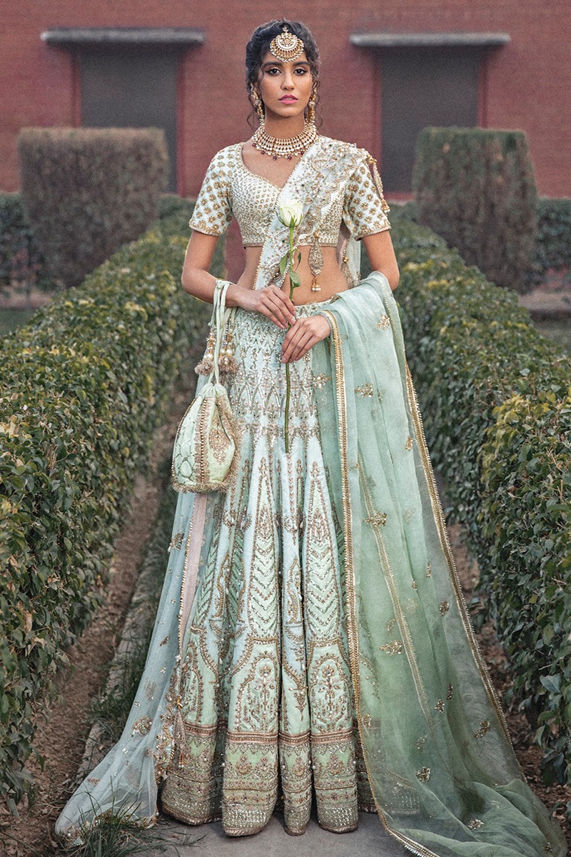 A luminous five-piece bridal ensemble in refreshing mint tones, blending airy silk textures, delicate hand embellishment, and layered dupattas for an effortlessly elegant bridal look.