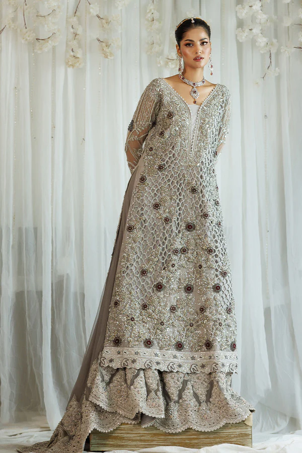 Heavy cutwork detailing paired with stones, qora dabka, and delicate motifs arranged to enhance the outfit’s luxurious aura. The dupatta features fine purl chan embellishment for a balanced, elegant finish.