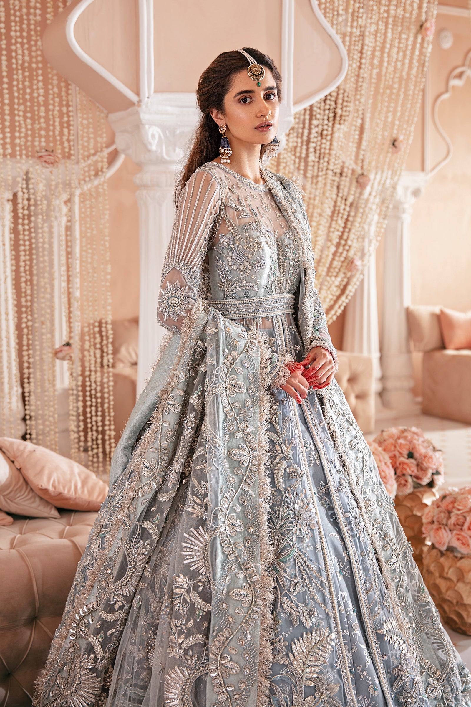An exquisite all-silver couture ensemble designed to dazzle, featuring intricate zardozi, crystal embellishment, and shimmering layers that transform every occasion into a celestial celebration.