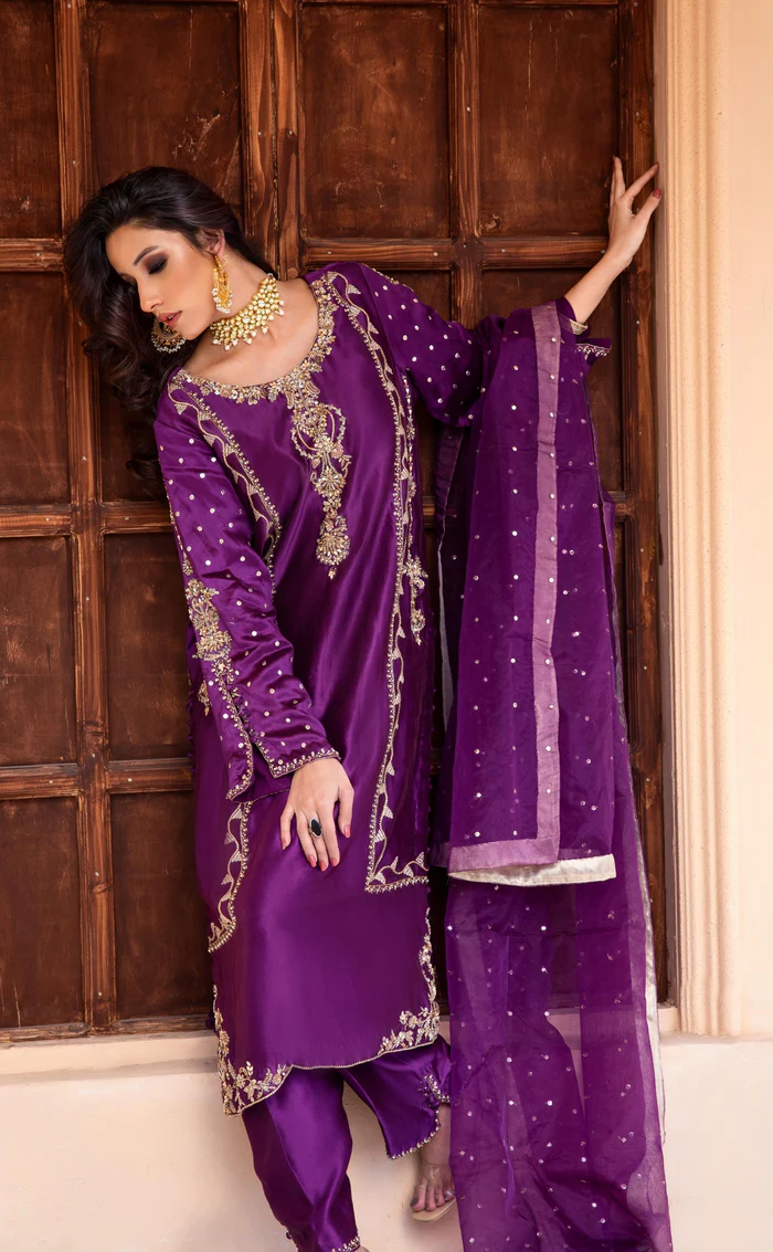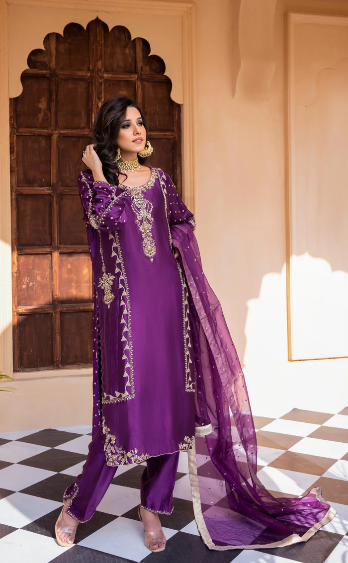 A regal purple outfit crafted in luxurious sheesh silk, adorned with fully handmade embroidery and paired with an ethereal organza dupatta for timeless elegance.