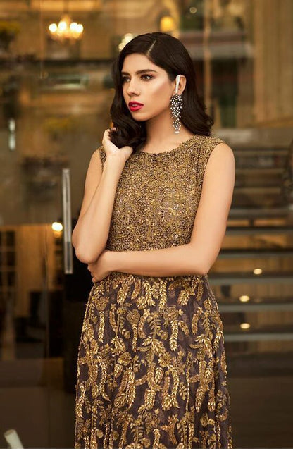 Intricate gold embroidery artfully applied along the bodice and hem, combining traditional craftsmanship with modern elegance.