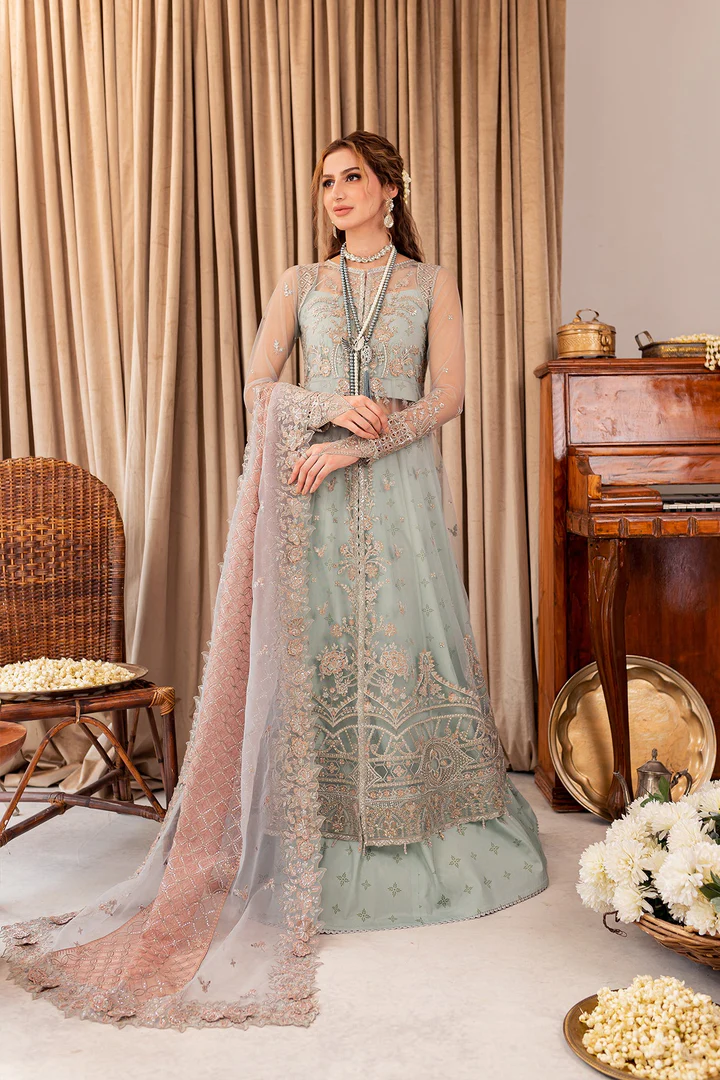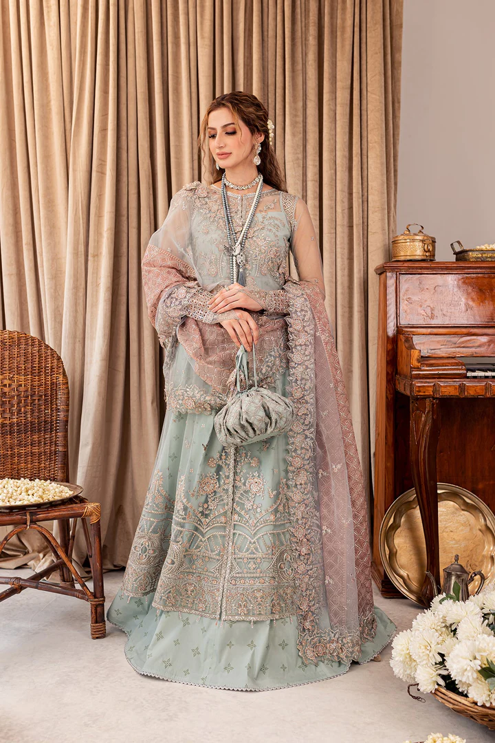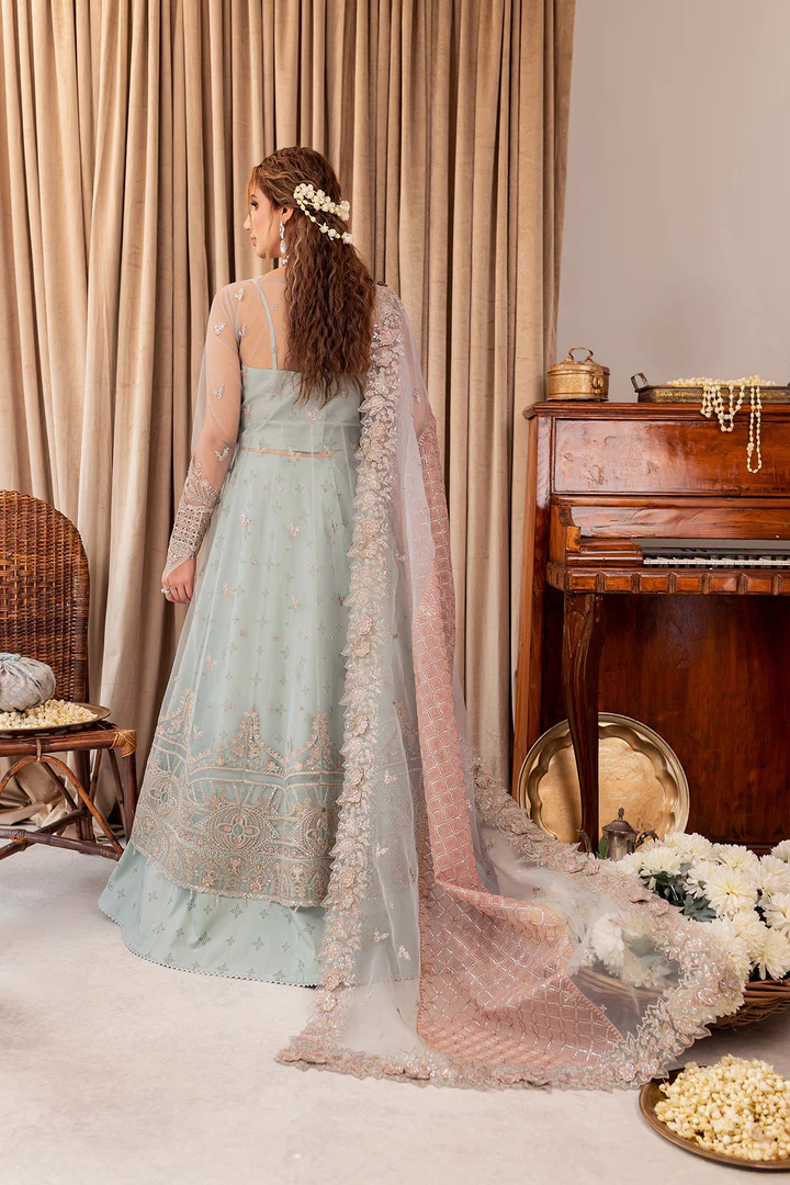 Completing the ensemble is a delicate net dupatta that enhances the overall elegance of this aqua Pakistani wedding dress. The dupatta features embellished borders and fine threadwork that echo the detailing of the gown shirt. Handworked accents add a polished finish, allowing the dupatta to fall gracefully while elevating the ensemble’s festive appeal.