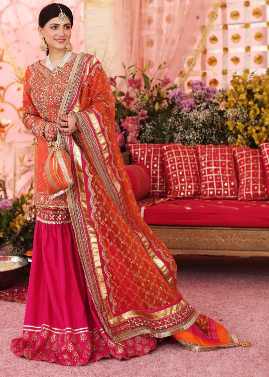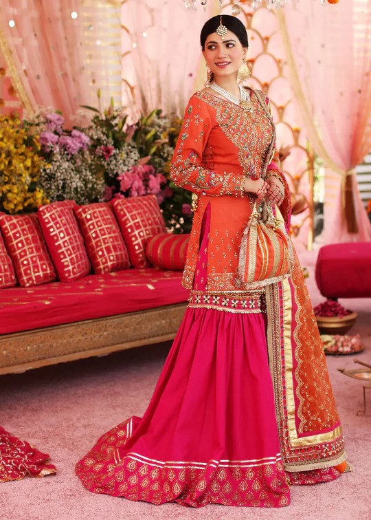A luxurious maroon bridal outfit paired with a gold dupatta, crafted with intricate handwork, rich fabrics, and a regal sharara silhouette for an unforgettable bridal appearance.