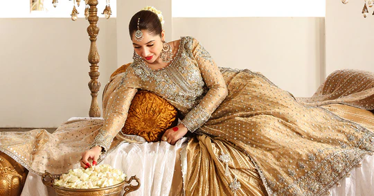A regal gold tissue ensemble featuring a long shirt and bustier with hand-applied dabka, naqshi, wasli, and mukaish, paired with a crushed sharara and coordinating dupatta, offering timeless elegance for weddings and festive events.