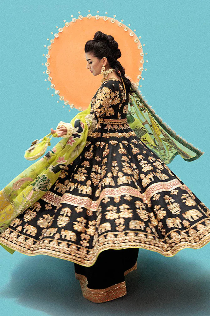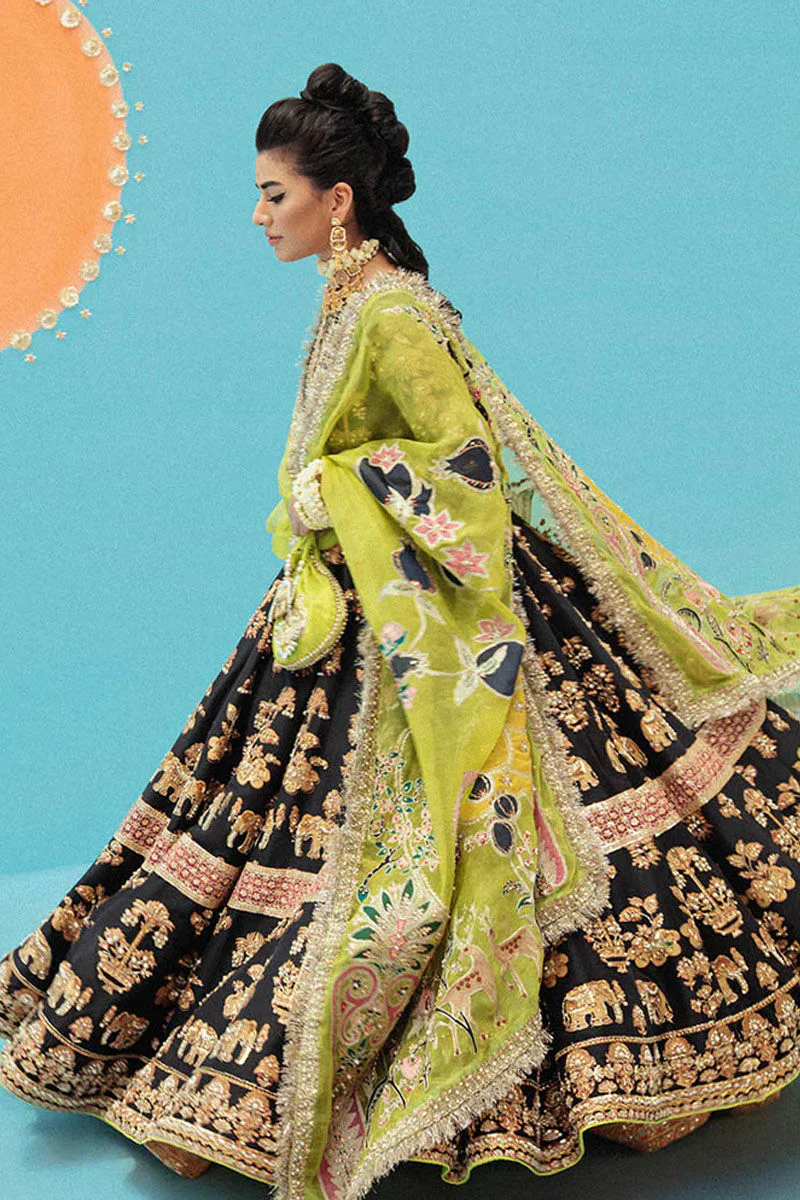 Black and gold for the pishwas, complemented with pink and orange borders, paired with a dhani green dupatta.