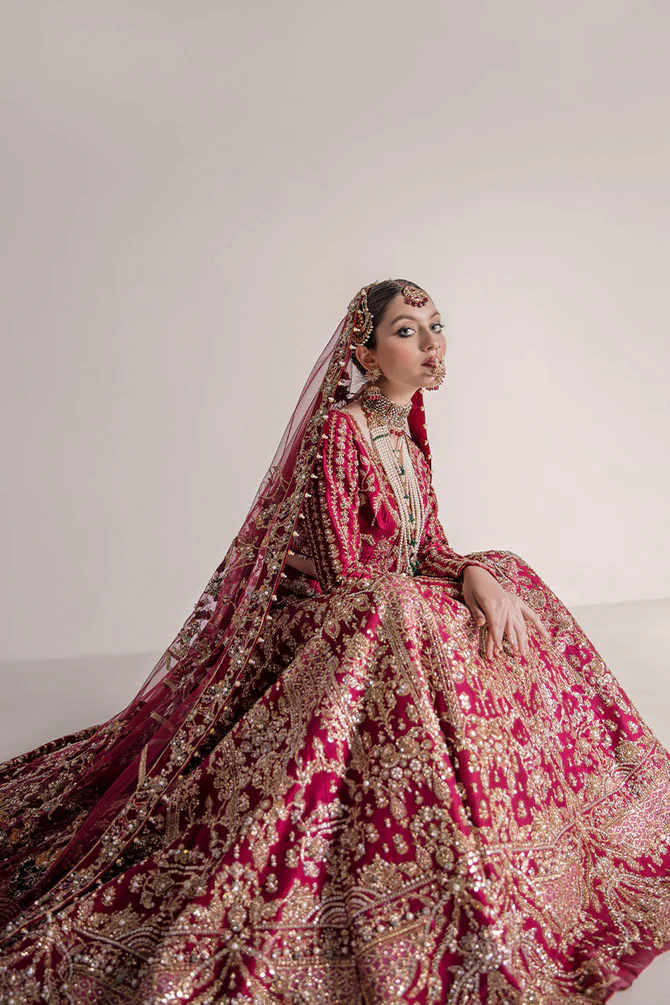 The raw silk lehenga features a graceful, voluminous flare that enhances the bridal silhouette. Decorated with elaborate dabka, kora, and sequin embellishments, the lehenga showcases traditional craftsmanship at its finest. Pearl-enriched borders frame the hem beautifully, adding a luxurious finishing touch to this striking red bridal ensemble.