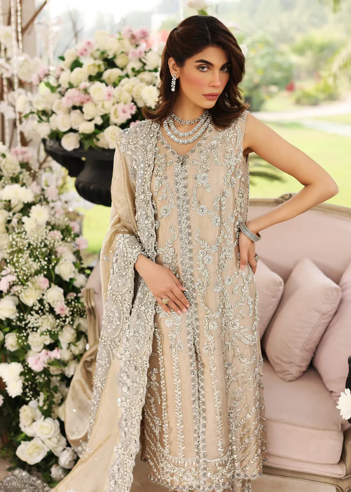 Completely handcrafted using sequins, beads, Swarovski crystals, cut-glass details, kora, naqshi, and tilla embroidery. Slight artisanal variations may occur, celebrating the authenticity of hand craftsmanship.