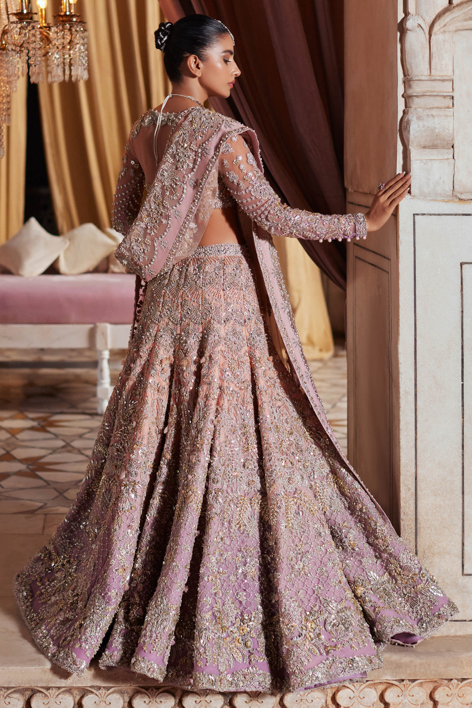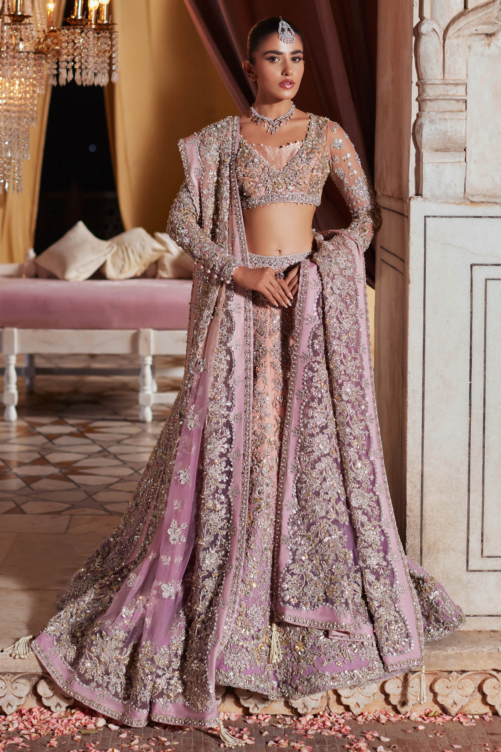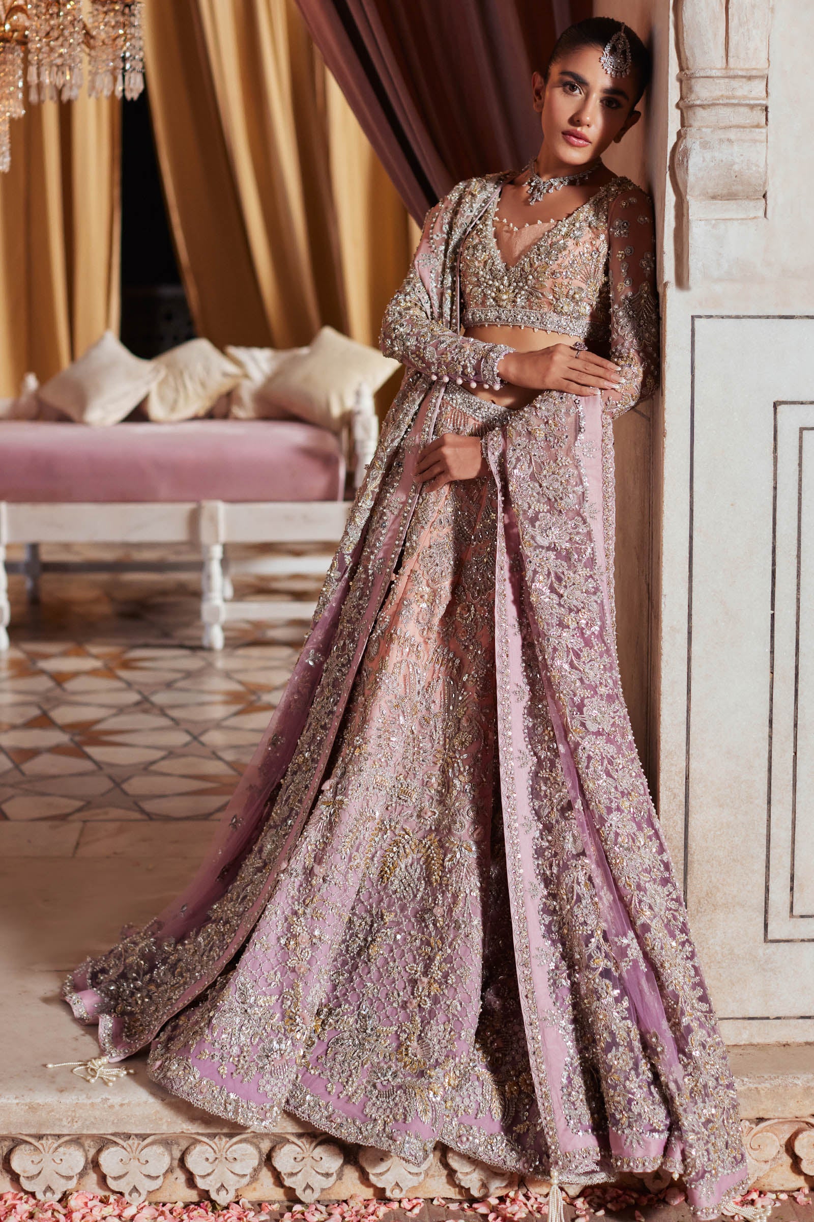 A dreamy bridal masterpiece, Aurielle features a blush-periwinkle lehenga encrusted with stones, gotta, and hand-cut floral appliqués, paired with a delicate bustier and a meticulously detailed dupatta.