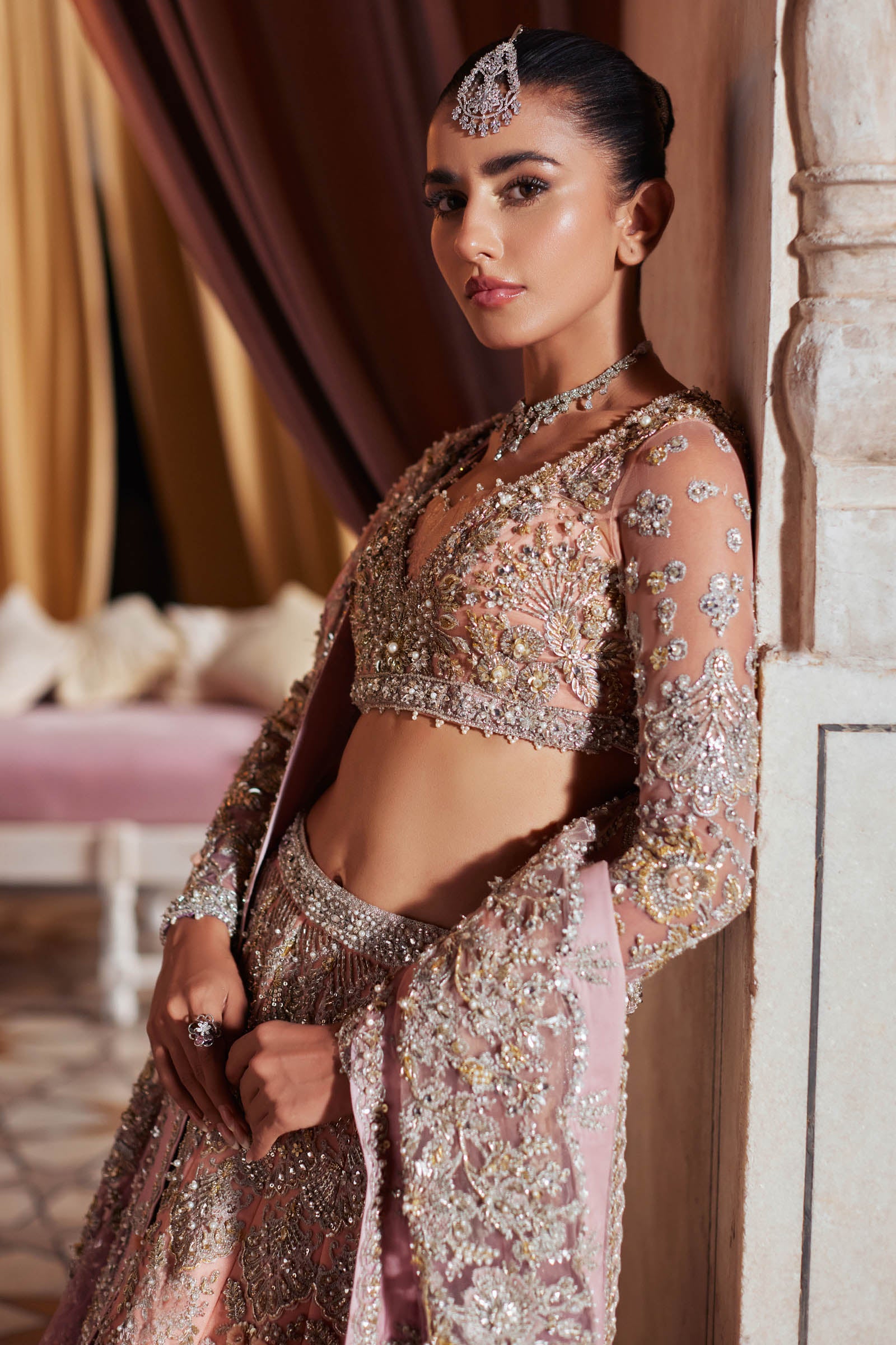 The ensemble is paired with a delicate bustier that complements the opulence of the lehenga. Subtle embellishments and refined tailoring ensure a harmonious balance between elegance and structure, allowing the intricate details of the lehenga to shine.
