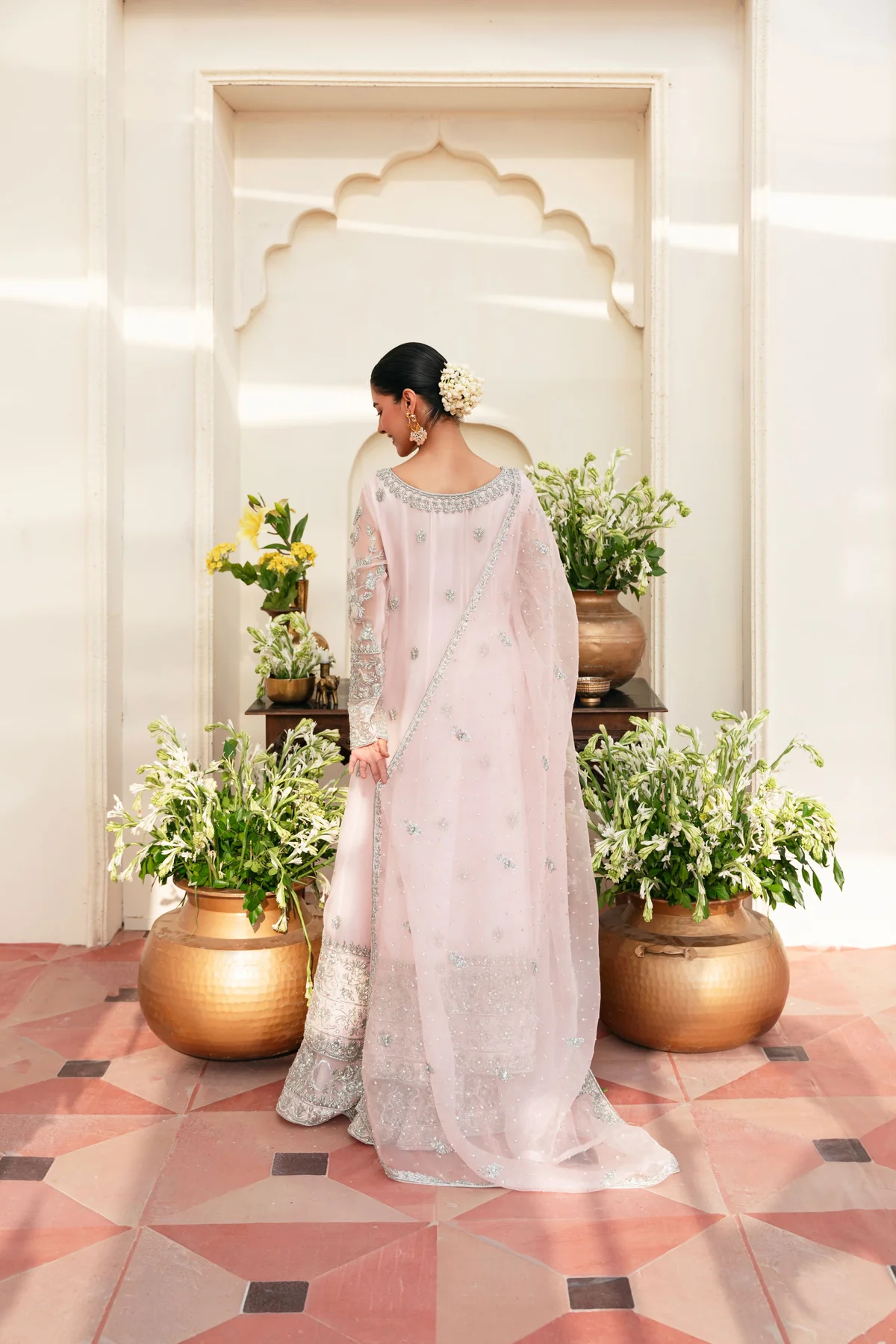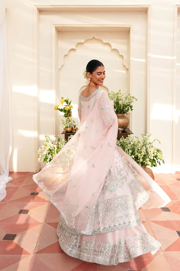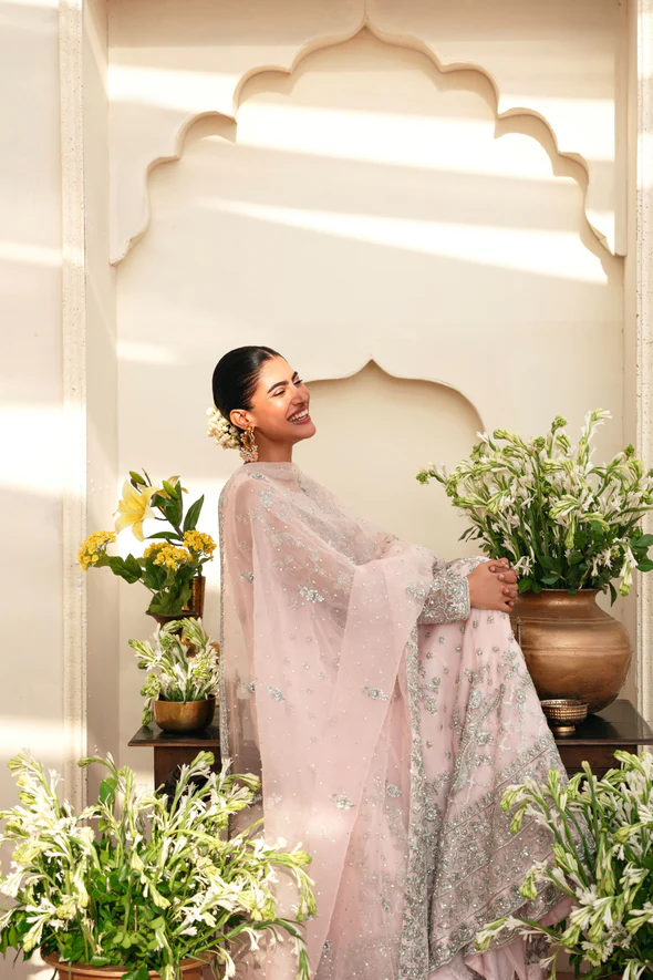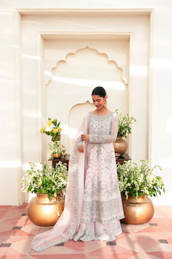 The kalidaar is designed in blush pink pure soft tissue and tailored into a long, fluid silhouette that drapes beautifully. It is heavily embellished with hand silver ada work, creating a luminous and refined bridal aesthetic. Pure silk finishings enhance the elegance, while the inner lining ensures comfort and structure.