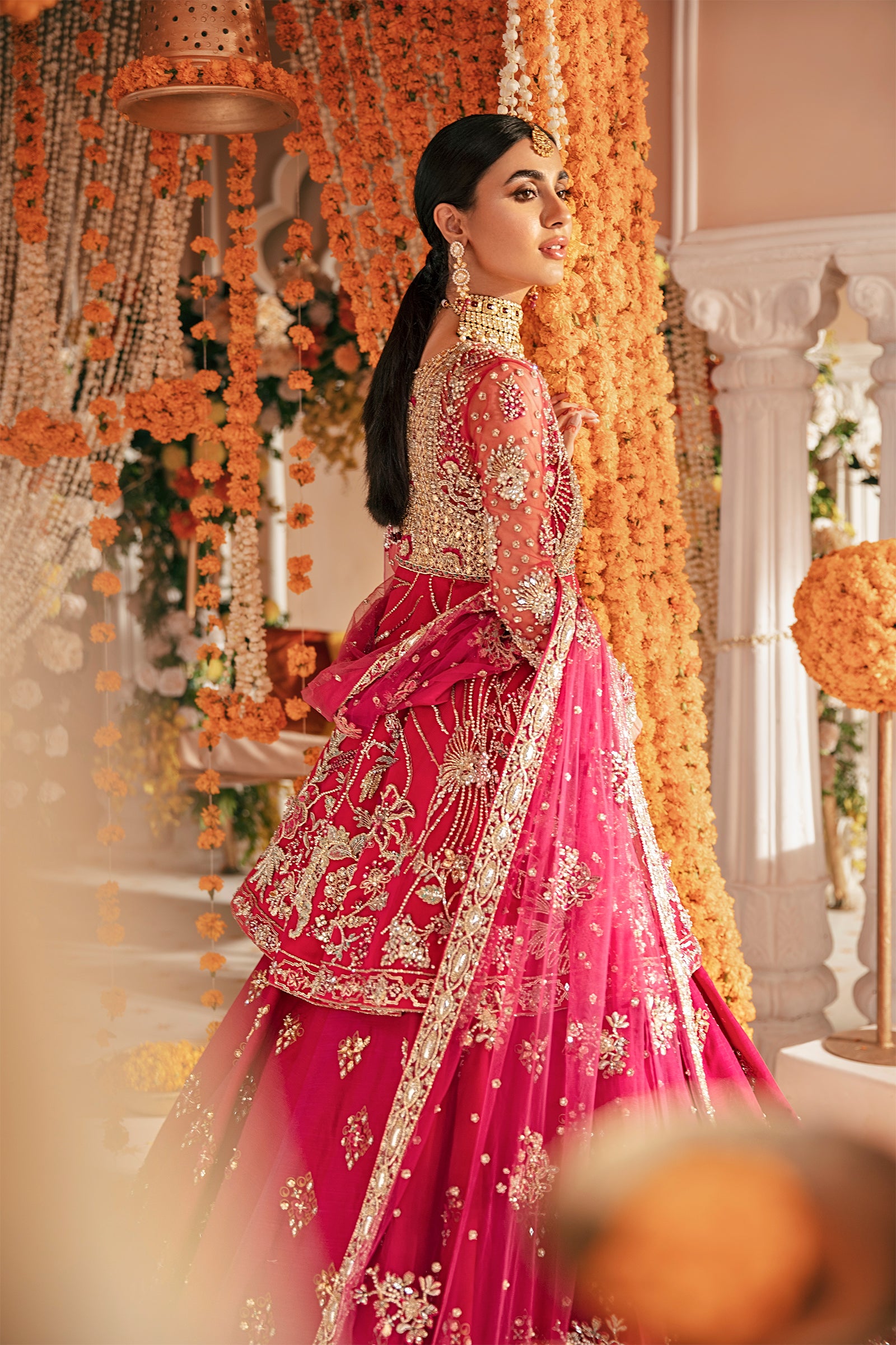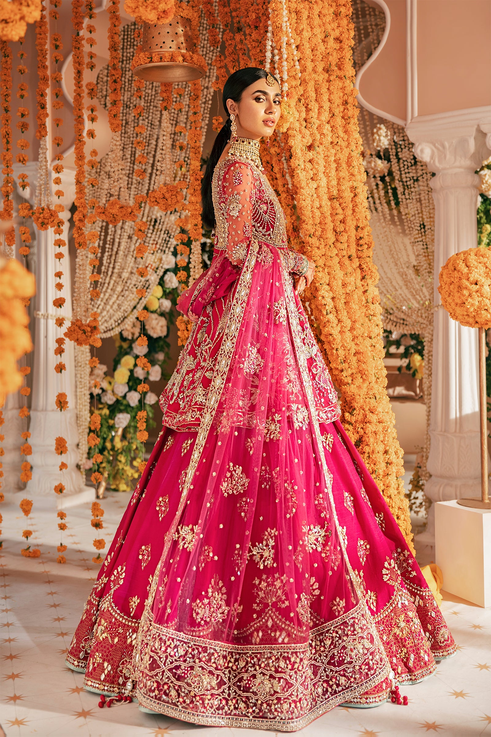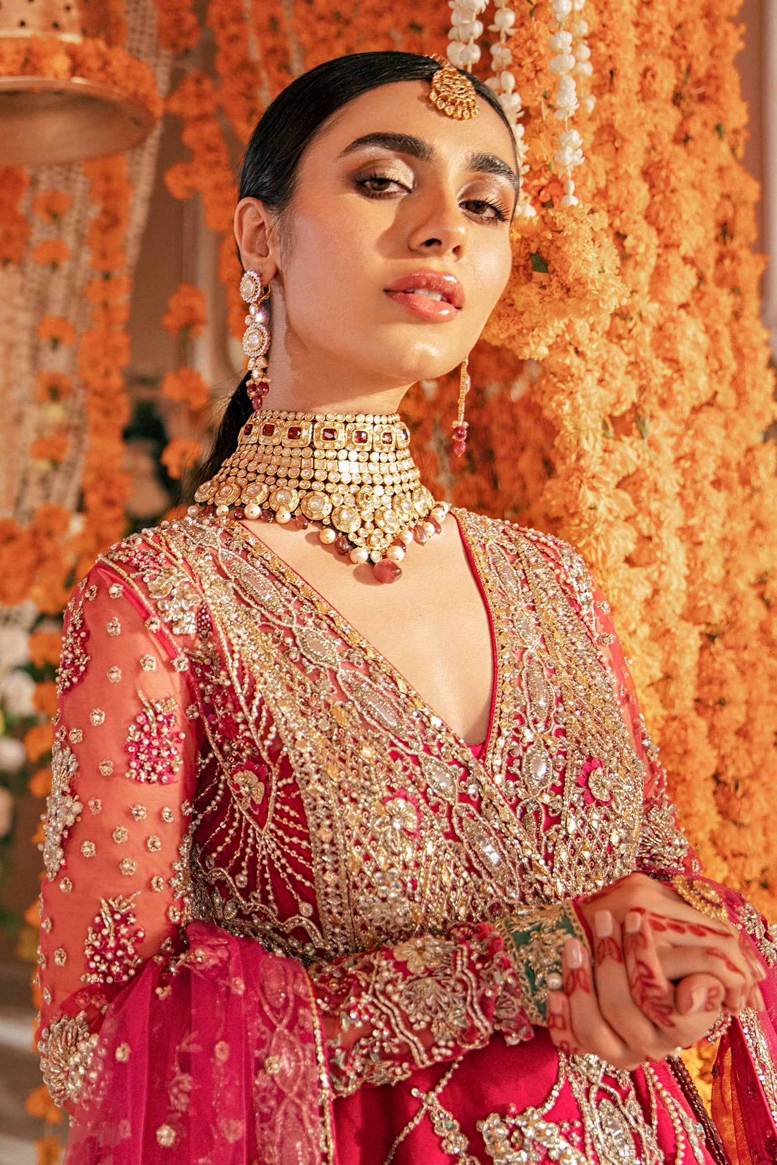 The short angrakha is crafted on a sheer net base in a soft blush pink hue, adorned with exquisite zardozi and gota embroidery that flows gracefully across the front panels and neckline. Intricate handwork enhances the overlapping silhouette, while fine embellishment details add dimension and refined sparkle. The lightweight structure allows effortless movement while maintaining a regal presence.