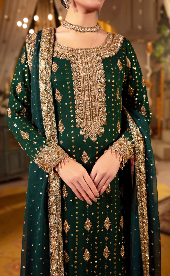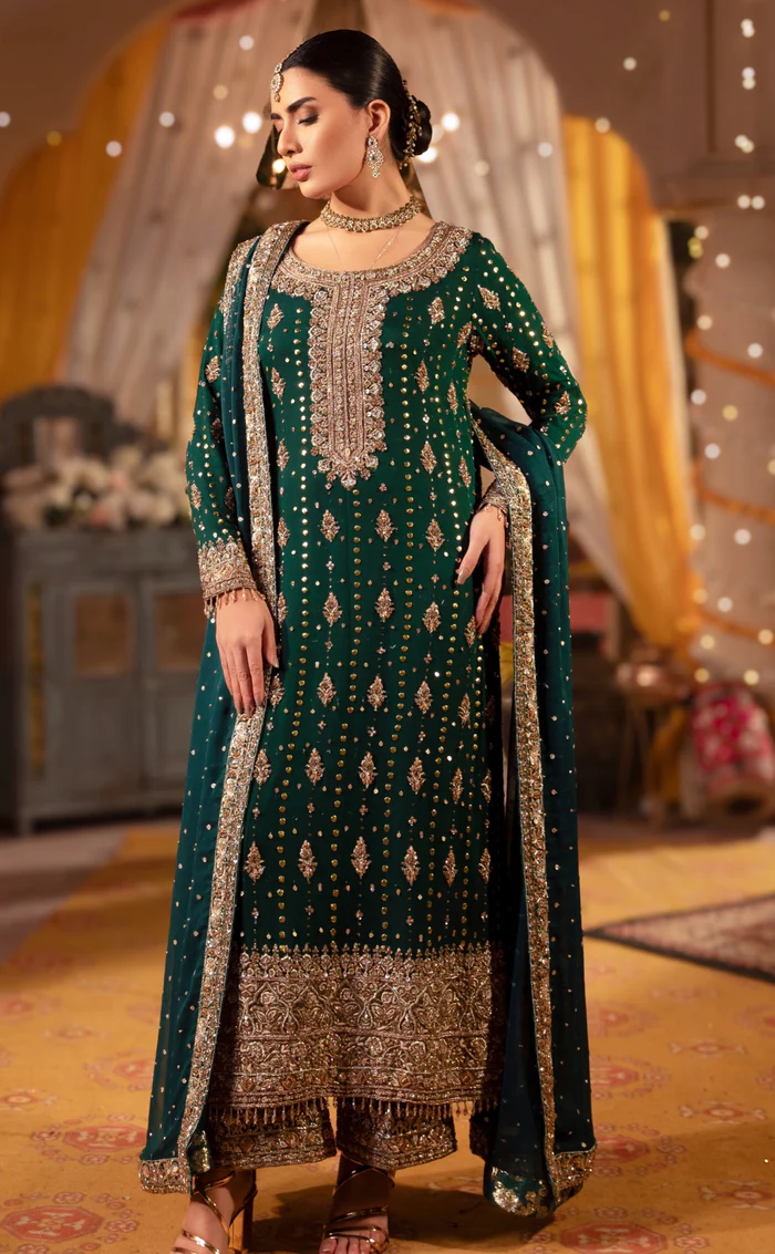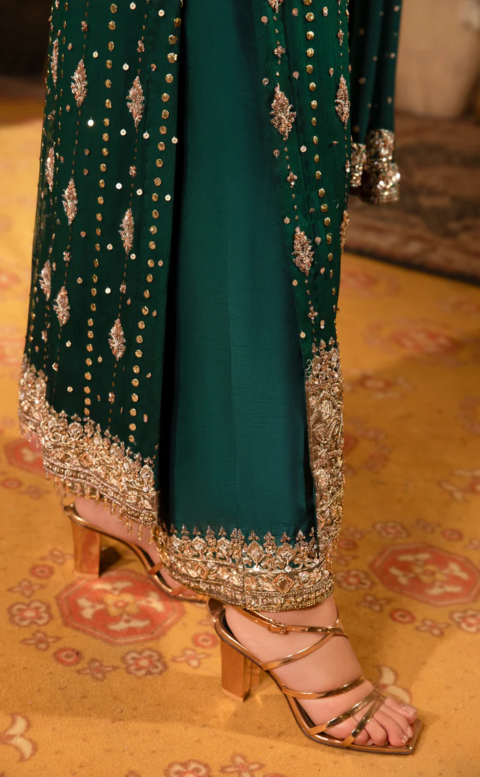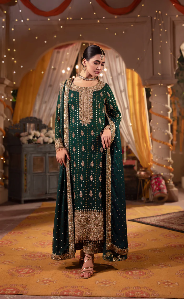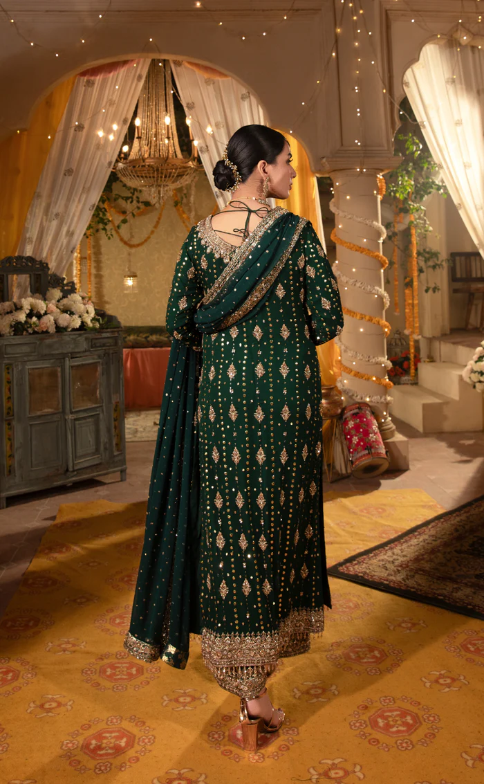A regal bottle green ensemble featuring a crinkled chiffon mukesh shirt, intricately embroidered raw silk trouser, and hand-embroidered organza dupatta—perfect for weddings, formal events, and festive occasions.