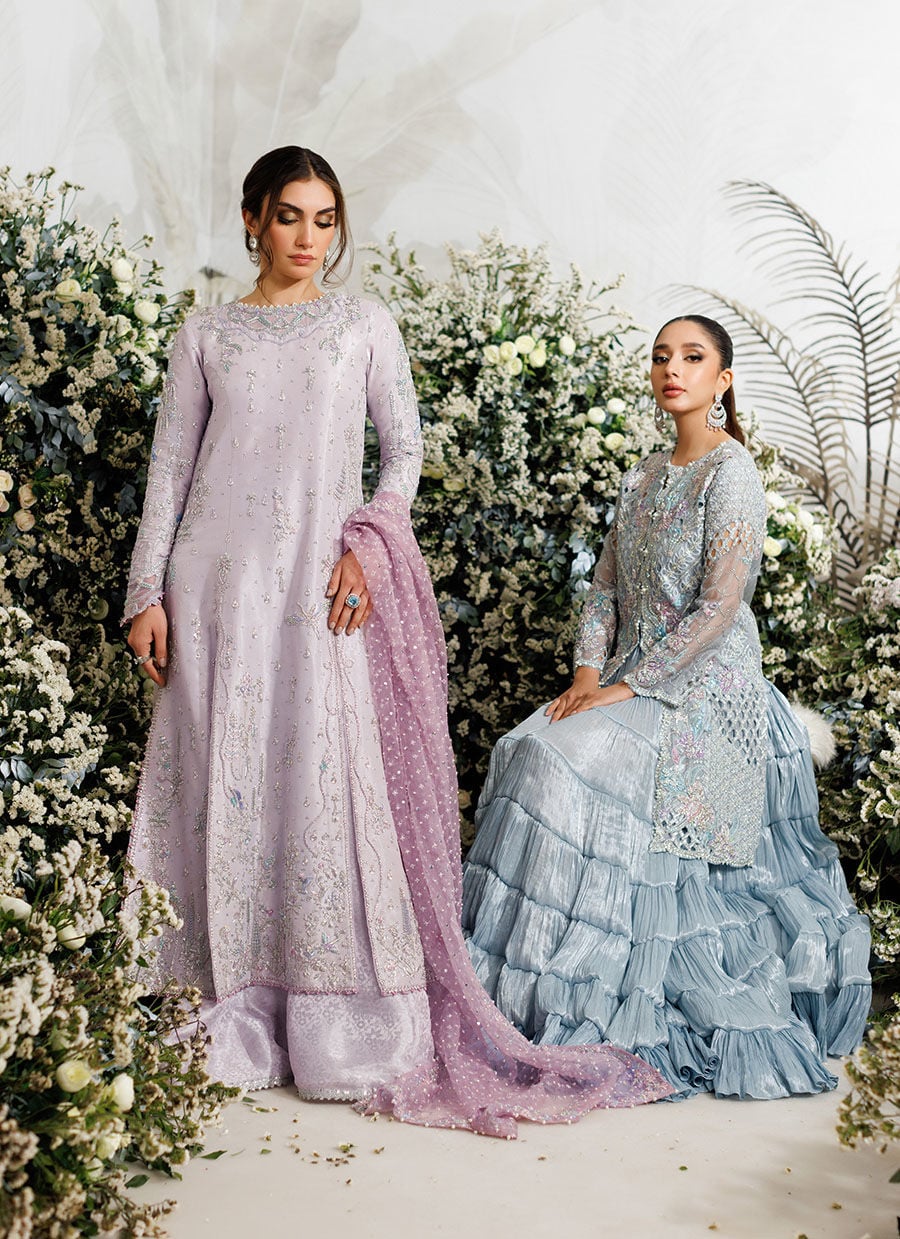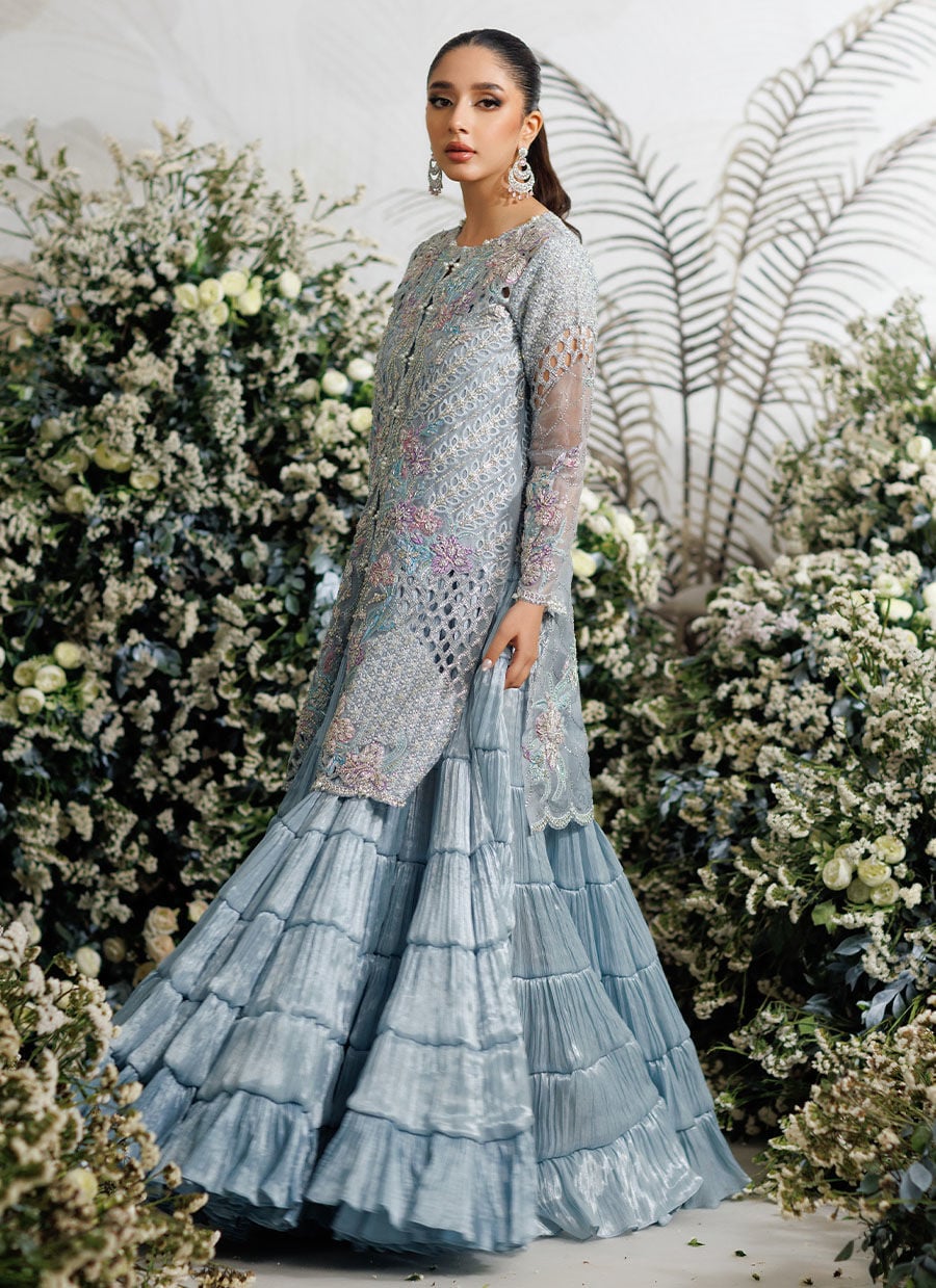 A modern interpretation of festive elegance, this dusty blue ensemble features a sheer, intricately worked jacket with pastel floral accents and unique lattice sleeves, paired with a sophisticated tiered shimmer skirt.