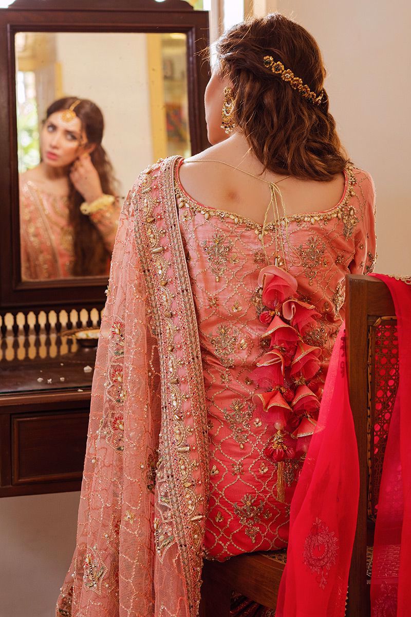 The kameez is designed in a graceful coral pink ombre palette, tailored to flow effortlessly while maintaining a structured bridal silhouette. It is adorned with signature chahaar bagh inspired motifs, brought to life through meticulous hand-stitched embroidery that adds depth, texture, and timeless elegance to the design.