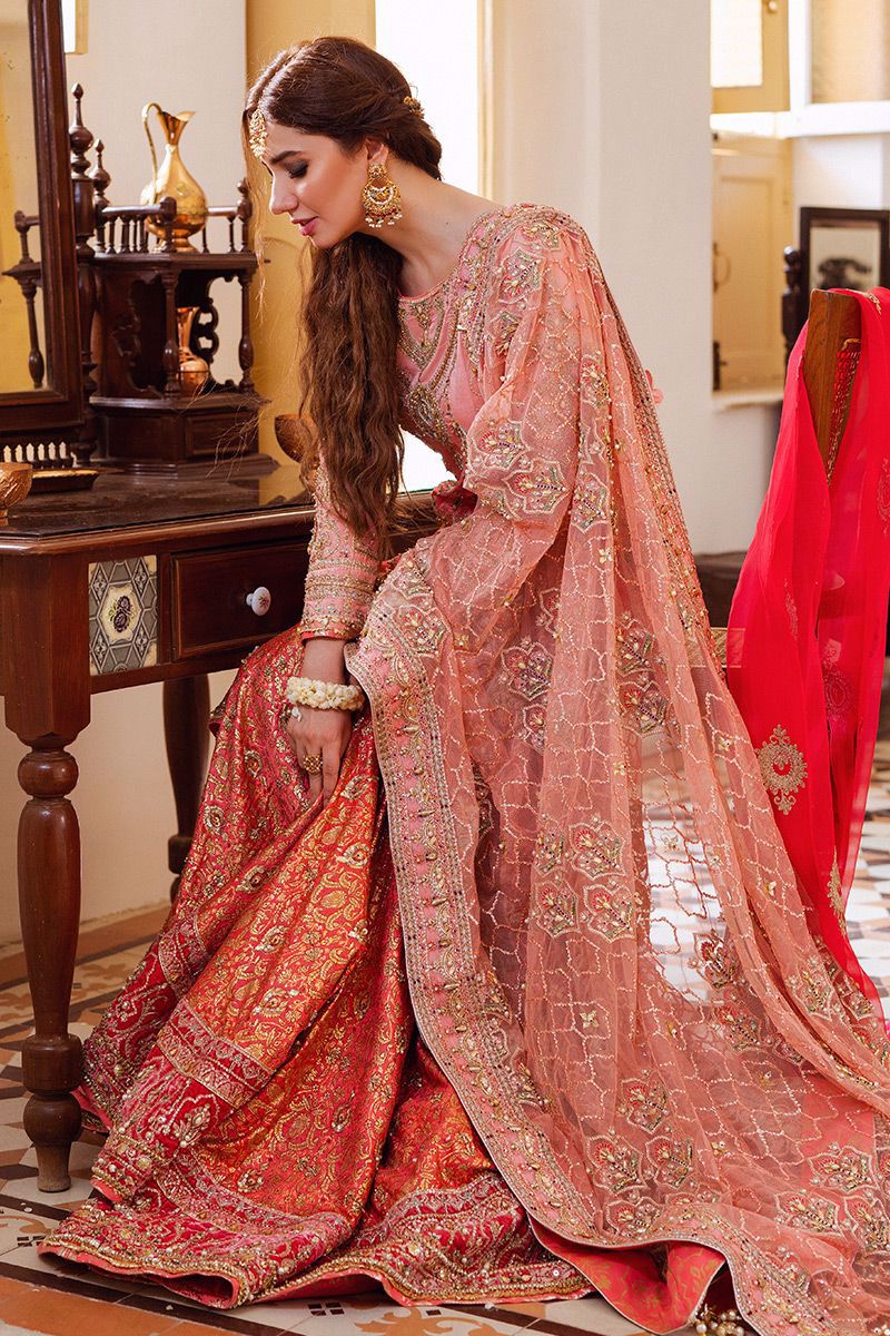 A refined five-piece bridal set blending soft coral tones with traditional craftsmanship, featuring an ombre kameez, classic farshi gharara, layered dupattas, and artisanal detailing for a statement bridal look.