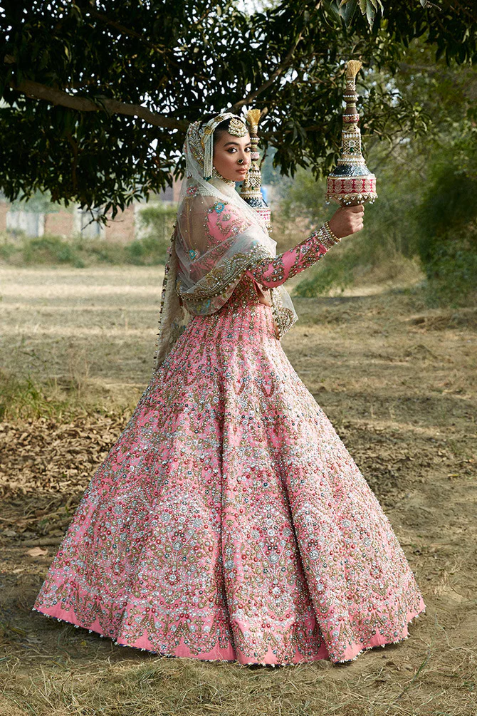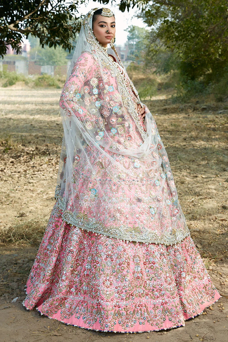 The matching coral pink raw silk lehenga mirrors the choli’s artistry with hand-applied adda work and intricate embellishments, creating a harmonious and luxurious ensemble. Its flared silhouette ensures a graceful drape, perfect for bridal elegance.