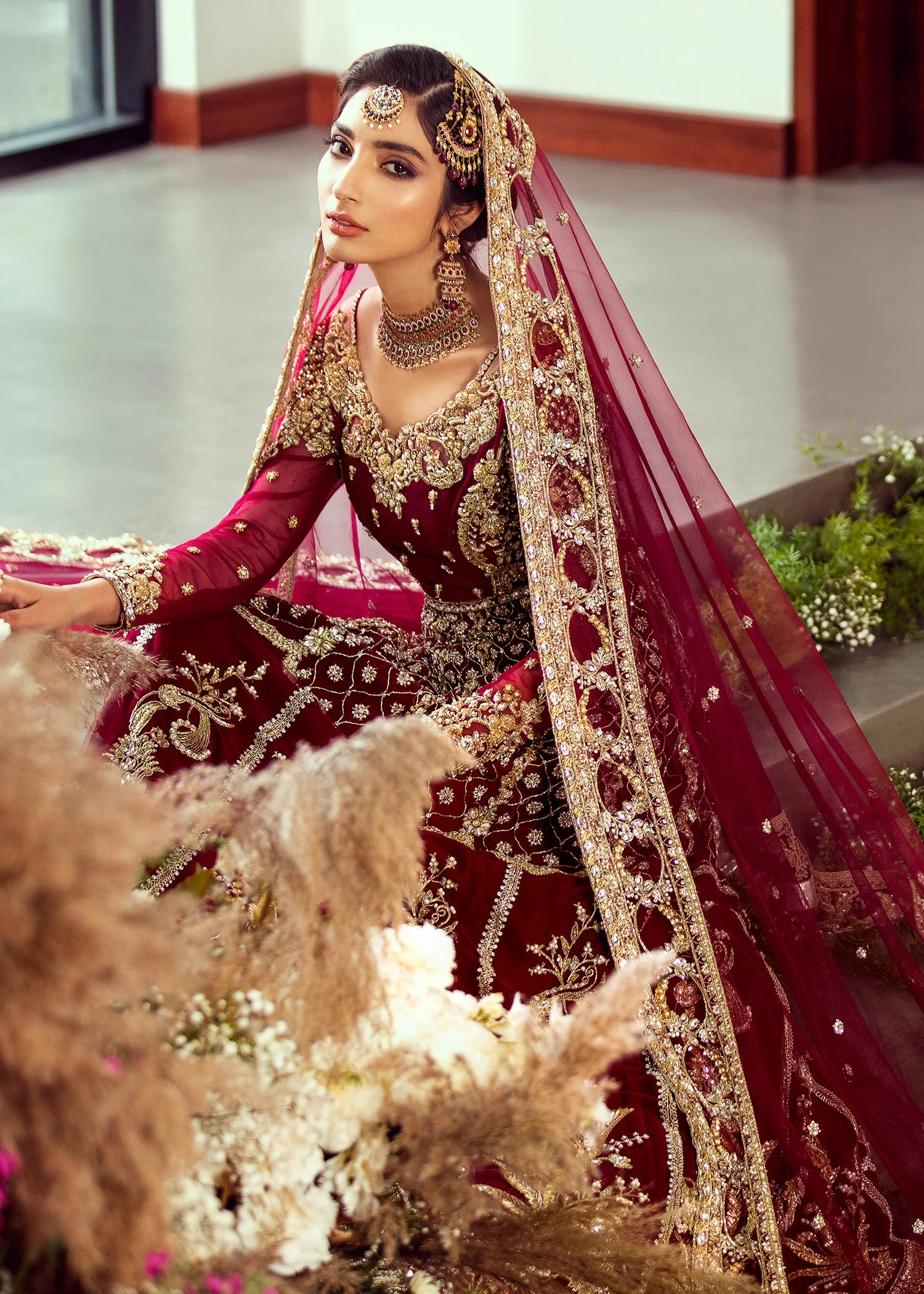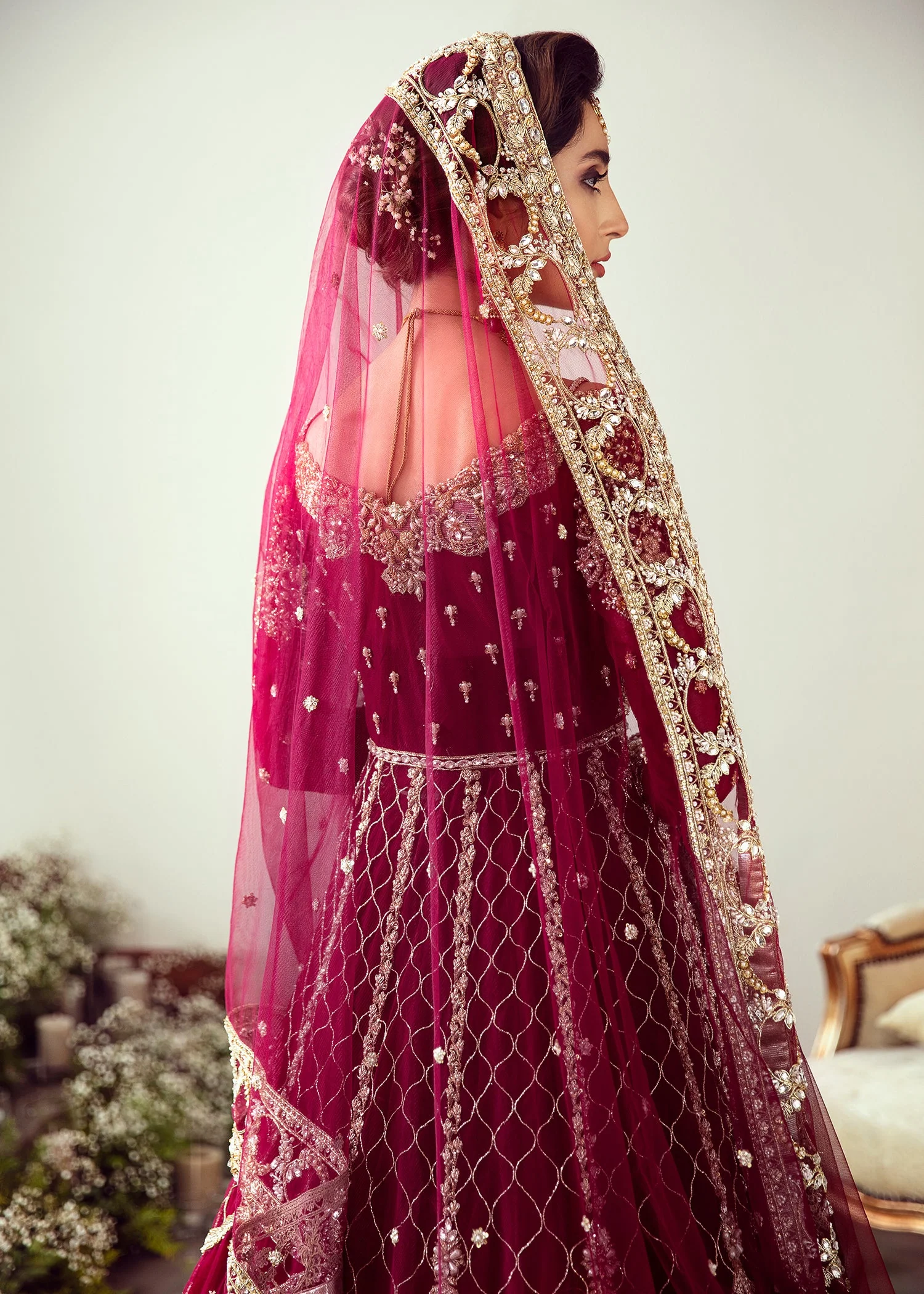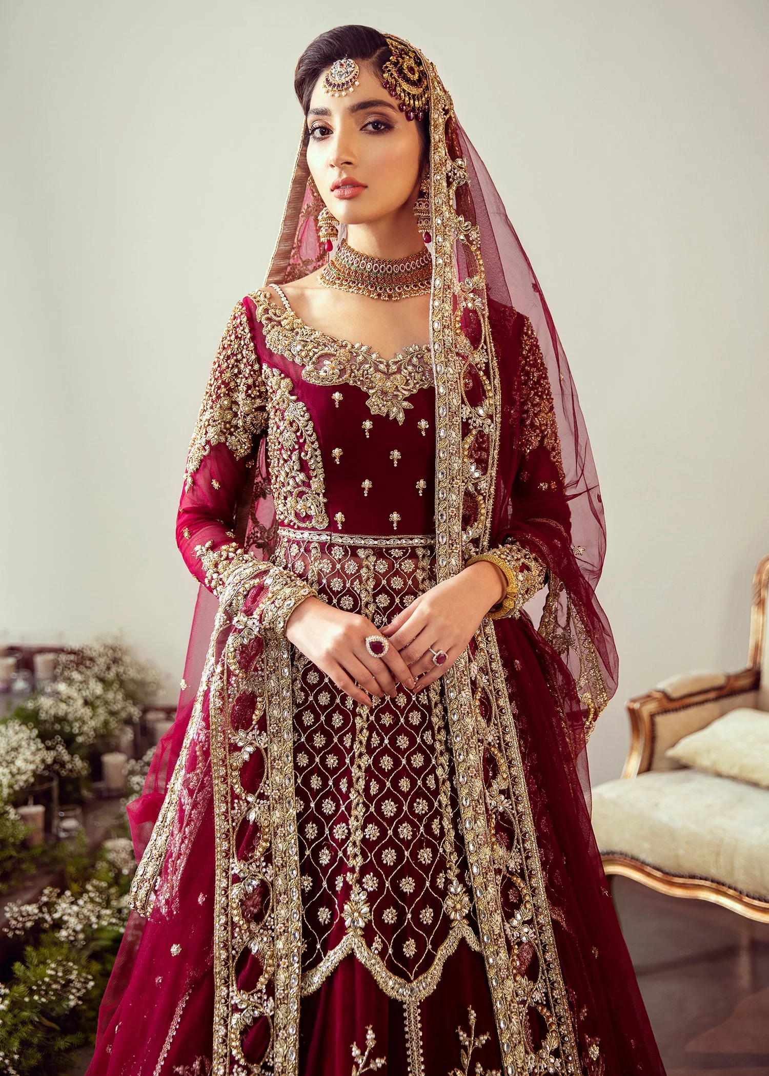 The pishwas is crafted from net and designed in a rich cranberry red tone. Gold embellishments and floral vine detailing are arranged across the surface, creating a shimmering and elegant effect. The silhouette flows gracefully, offering movement and refined structure while maintaining comfort through thoughtful lining.