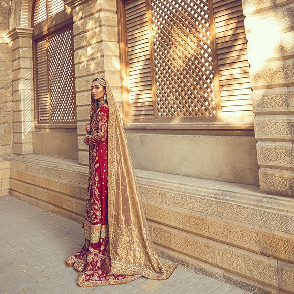 The kameez is crafted in a striking red tone and showcases traditional craftsmanship with detailed mukesh work and ornate embellishment. Floral motifs and beadwork add richness throughout the front and sleeves, while the long silhouette enhances the bridal grandeur. A smooth inner structure supports comfort and maintains the refined drape.