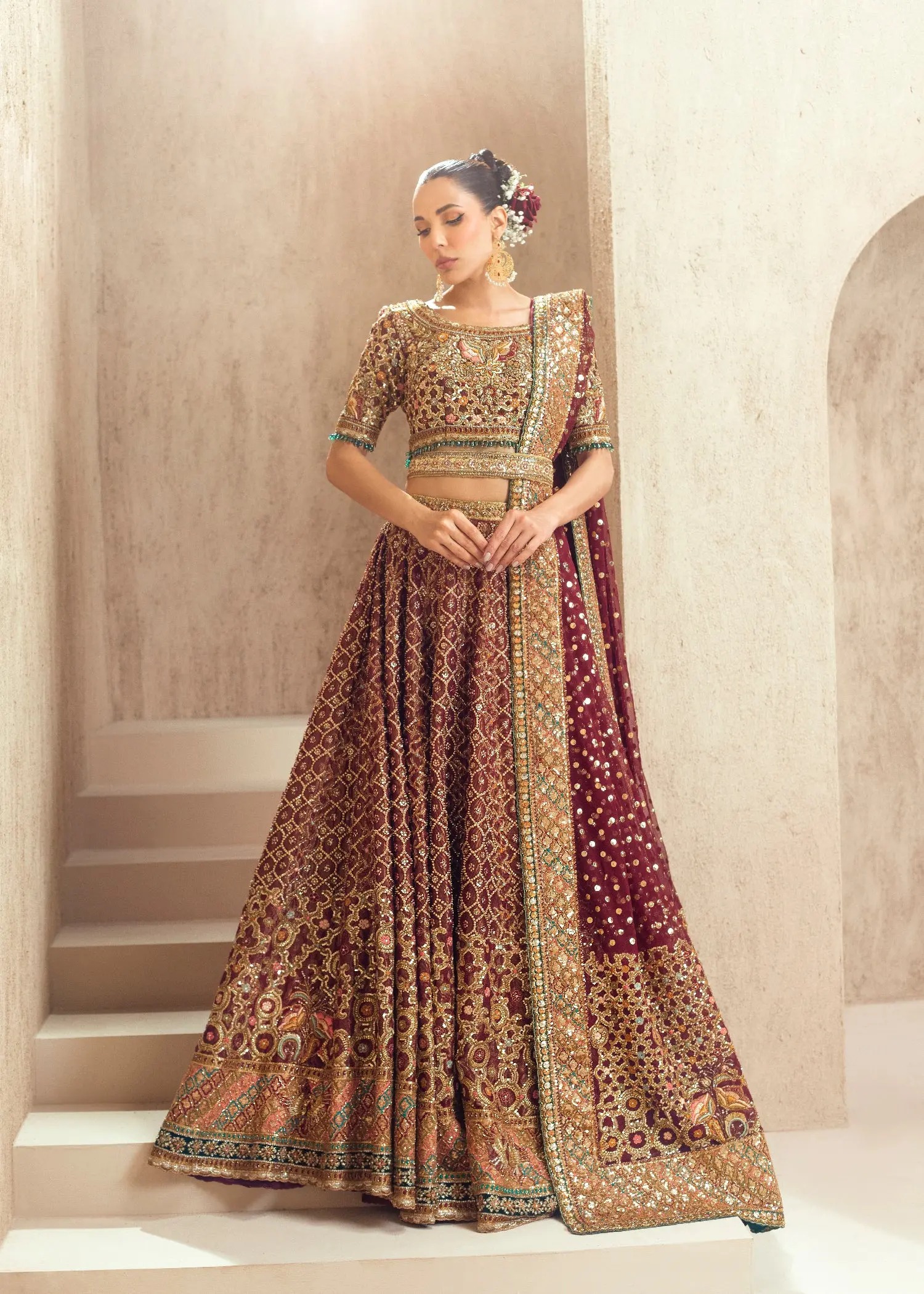 A timeless bridal masterpiece in deep maroon and crimson, featuring an intricately worked choli and a voluminous lehenga adorned with traditional gold zardozi, antique tilla, and artisanal floral motifs.