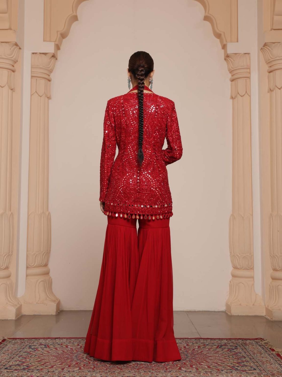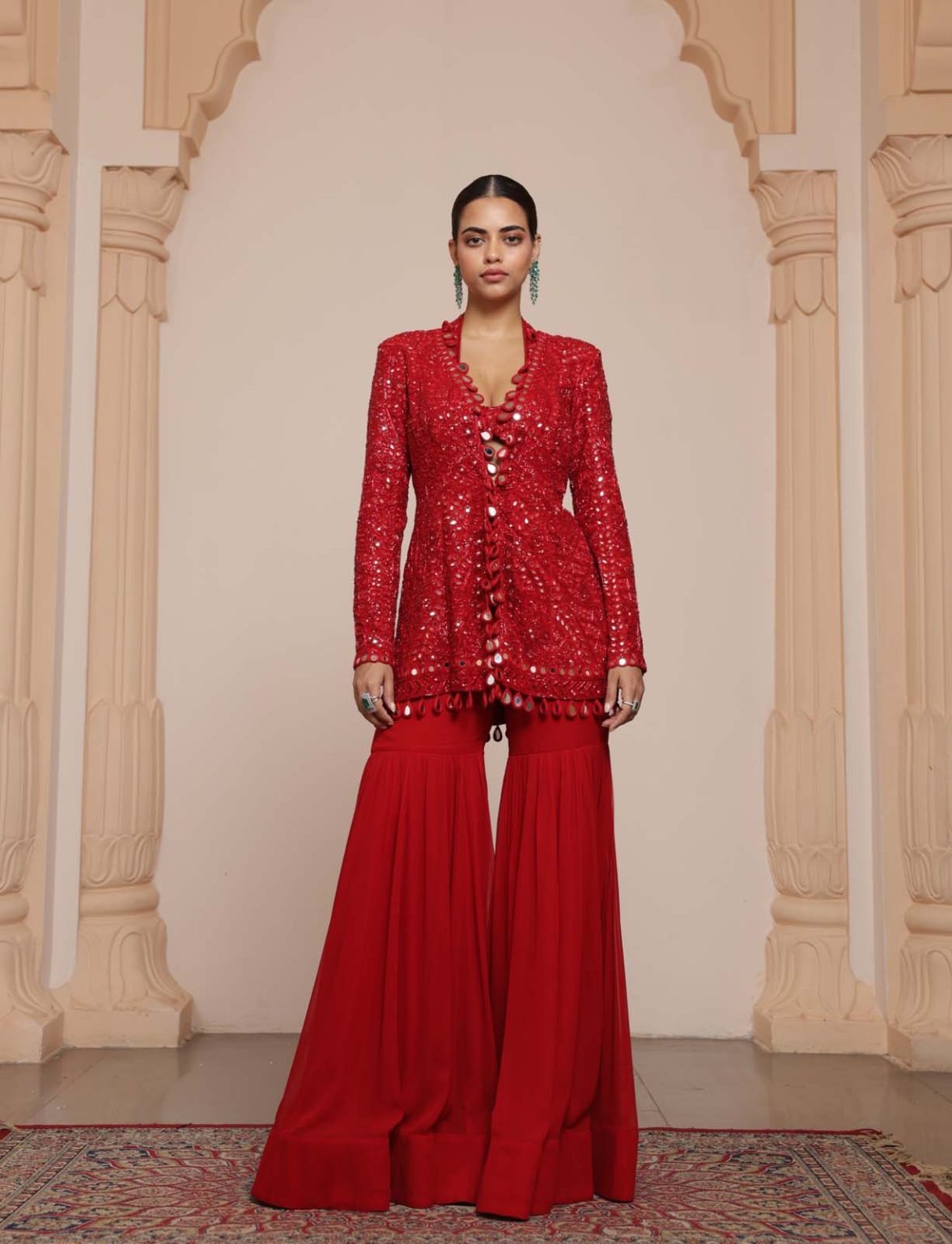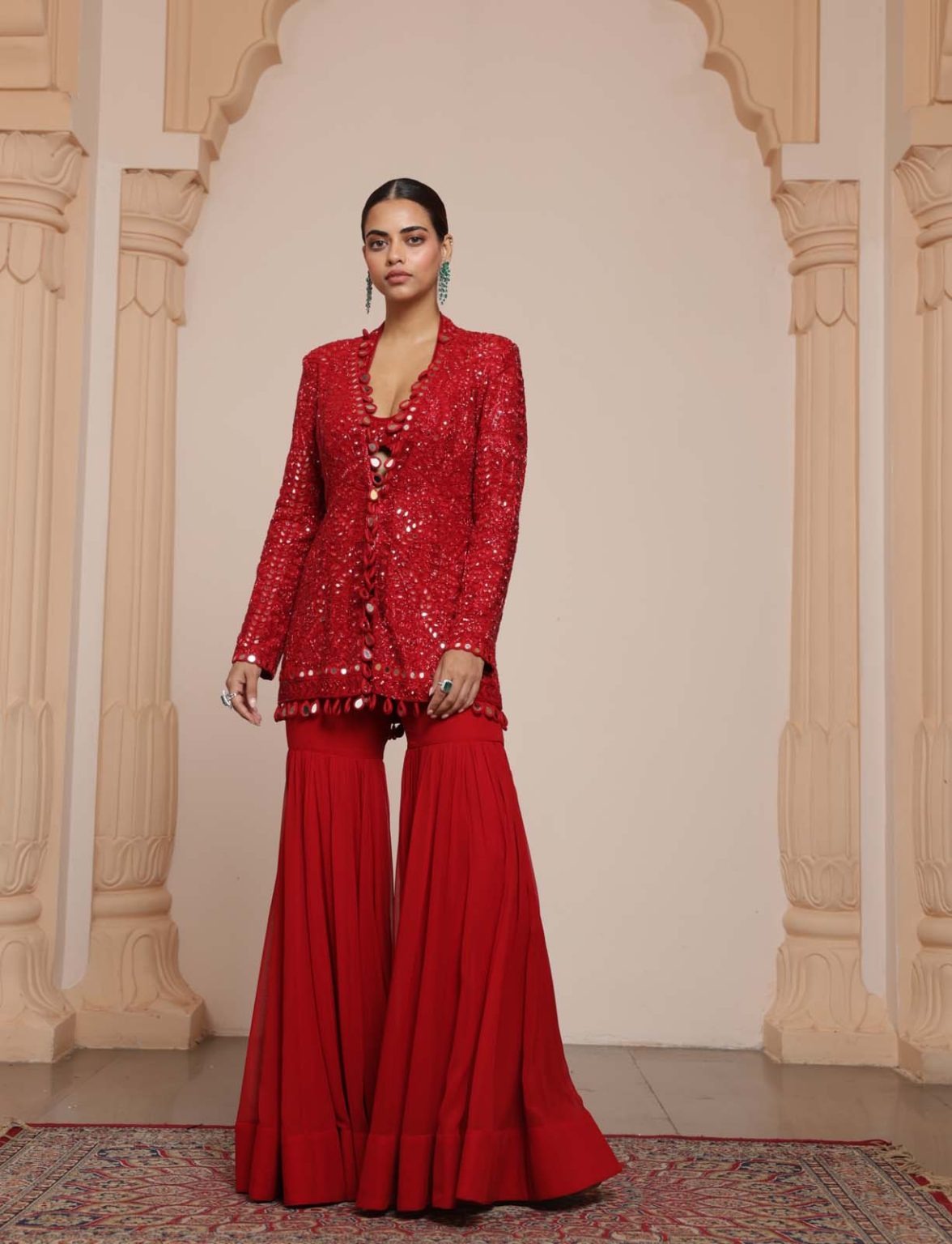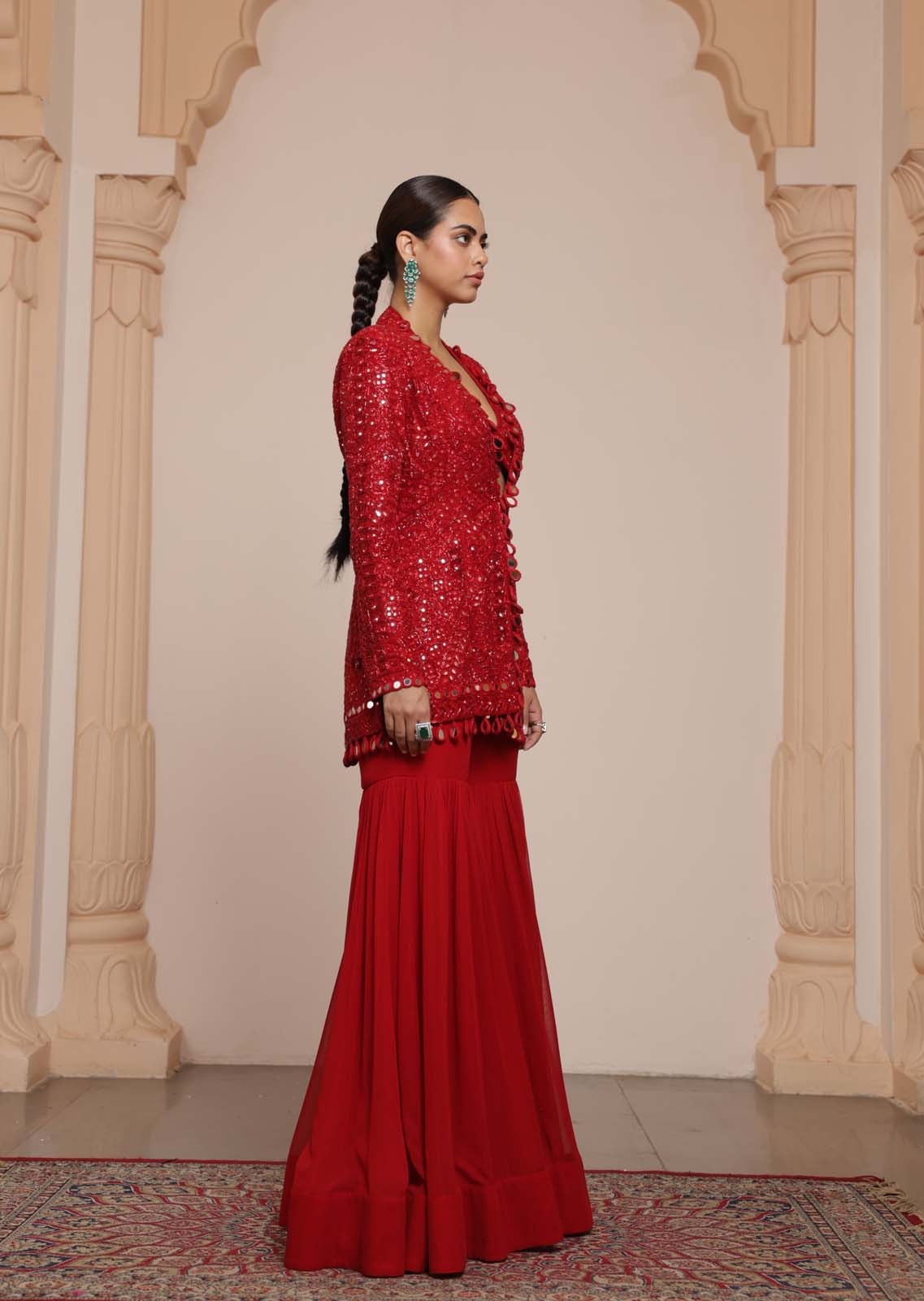 A handcrafted red jacket and blouse ensemble paired with a flowing georgette gharara, designed to fuse elegance with modern festive charm.