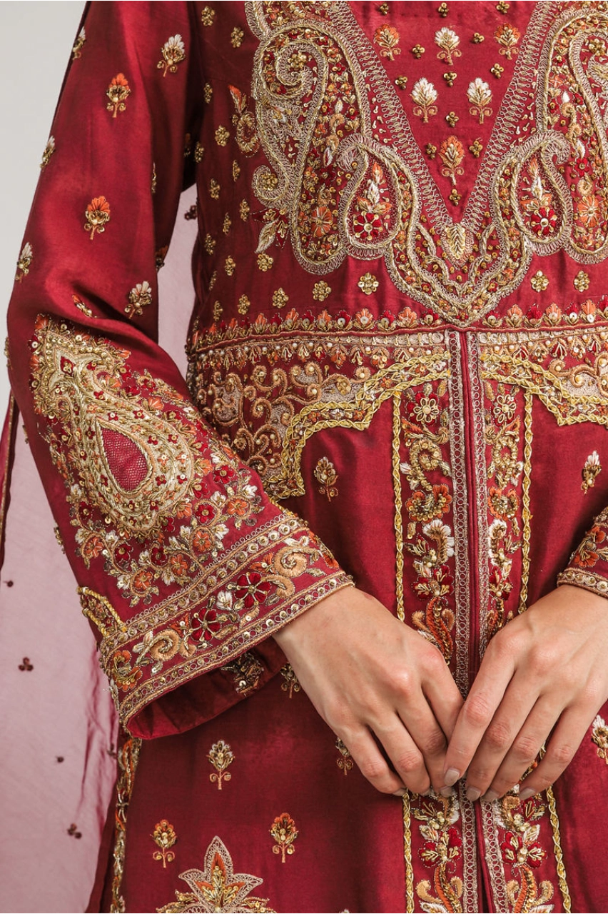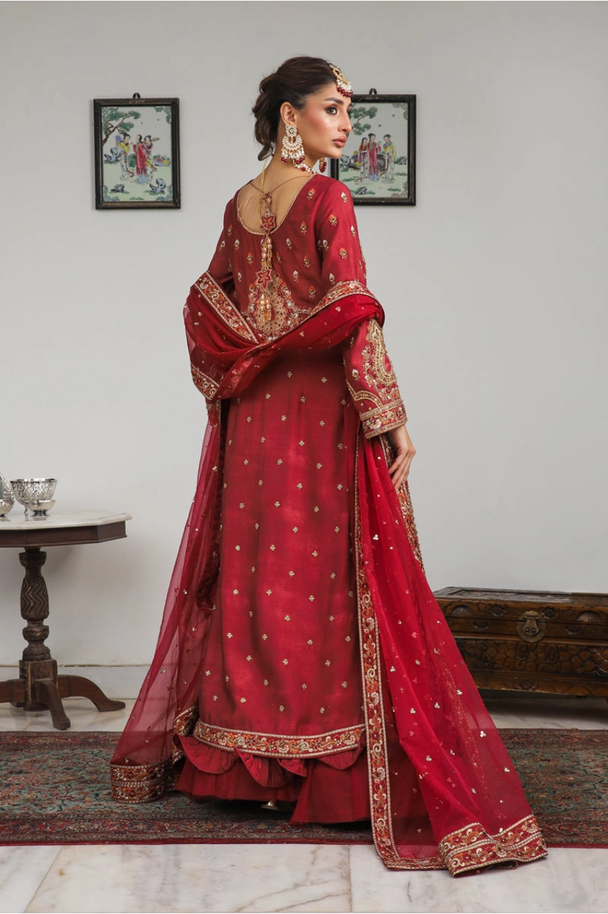 The ensemble is paired with a traditional crushed lehenga that adds volume and movement beneath the long kameez. Rendered in a matching crimson tone, the lehenga features delicate gold embroidery and shimmering sequin accents throughout. The flared silhouette balances richness with grace, making it ideal for bridal wear and formal celebrations.