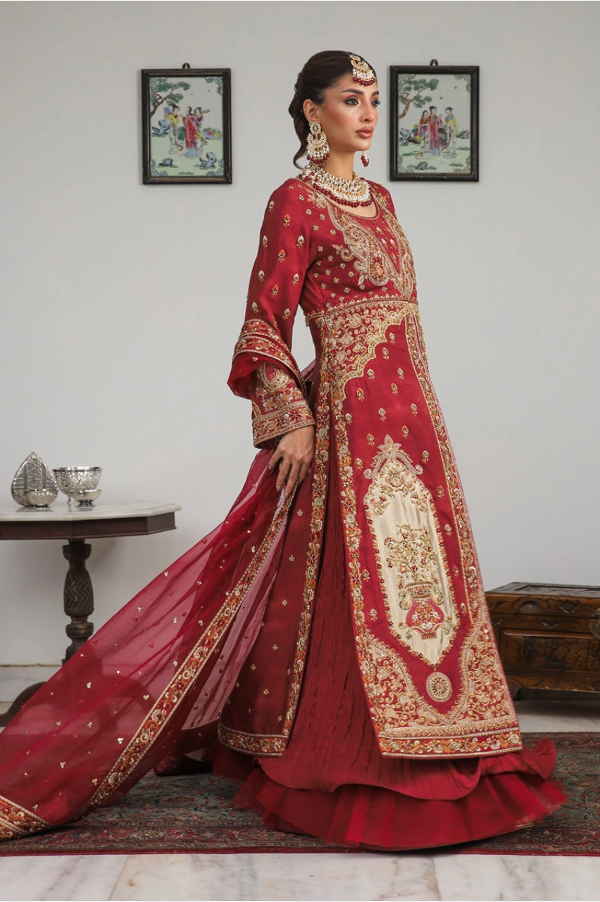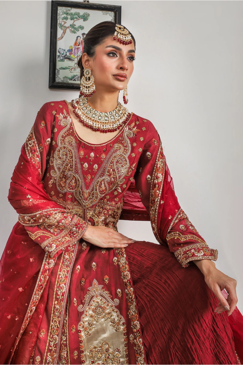 A regal crimson bridal ensemble inspired by Mughal couture, featuring lavish gold embroidery, crushed lehenga detailing, and an opulently embellished long kameez—perfect for a grand wedding or royal reception look.