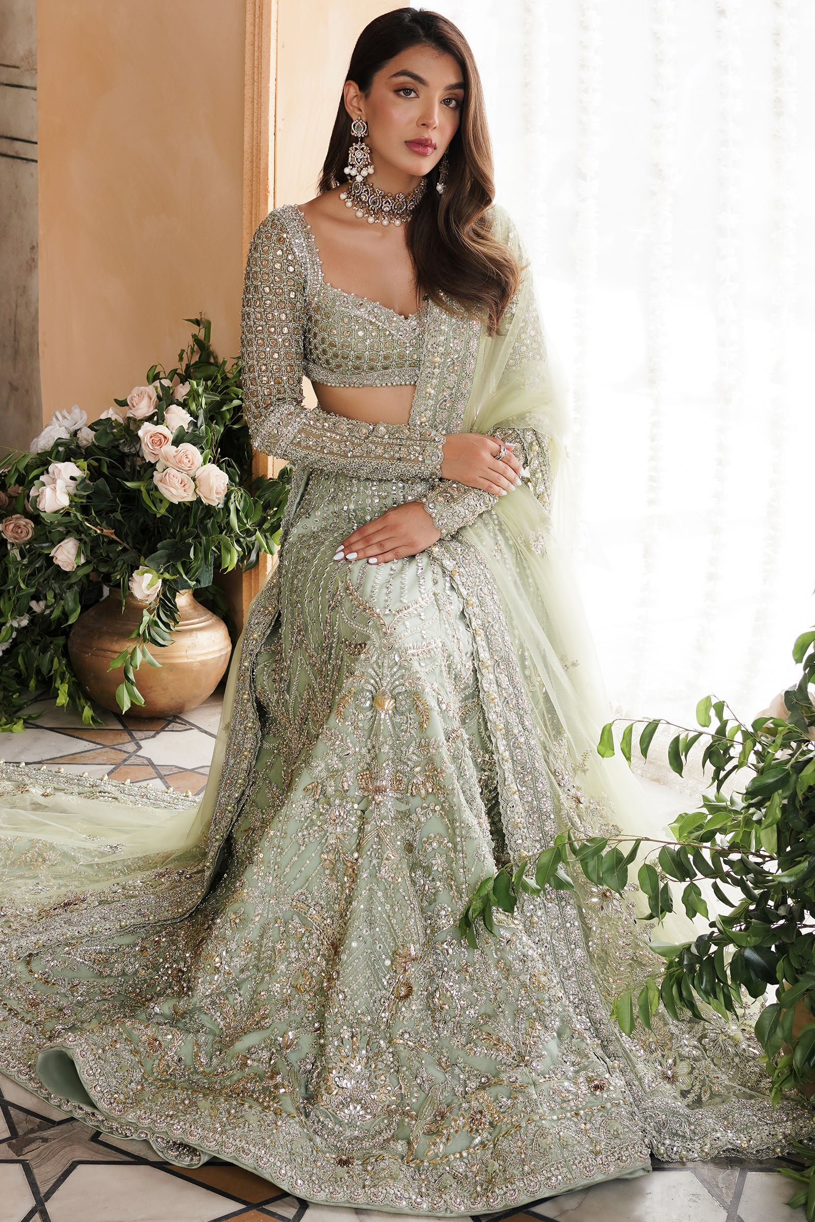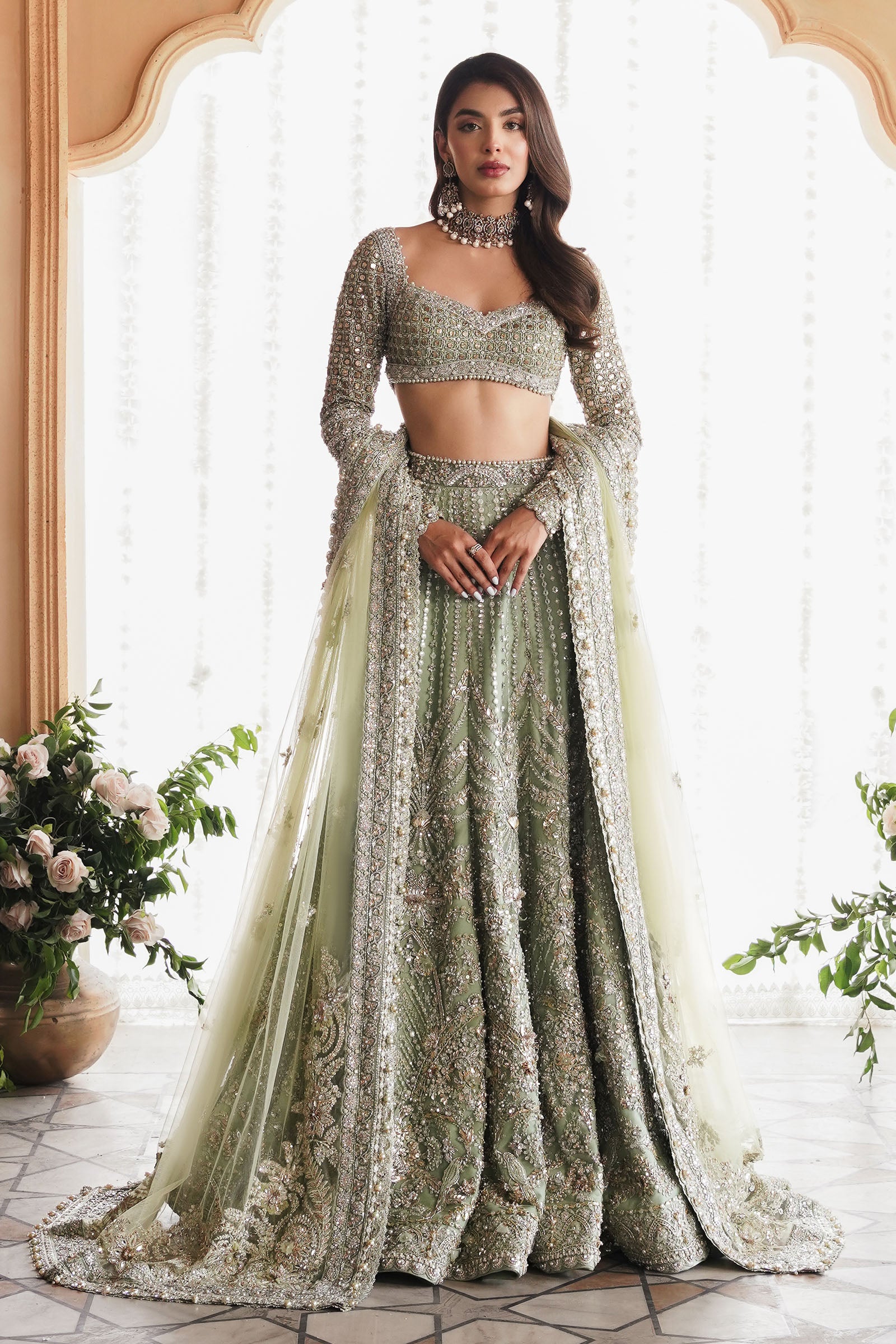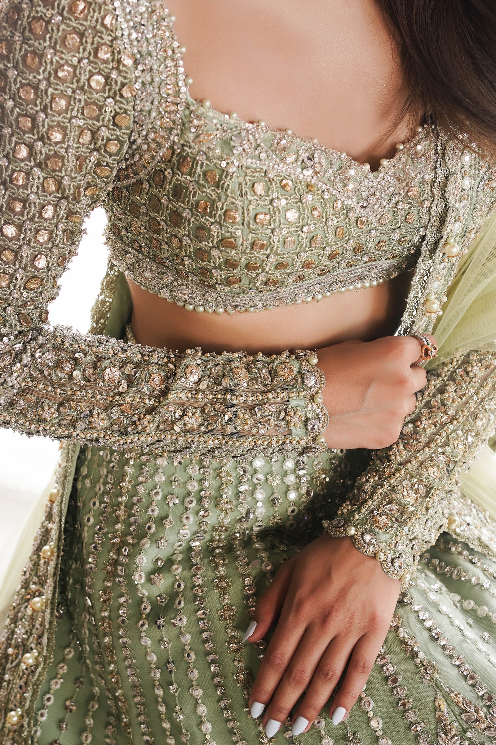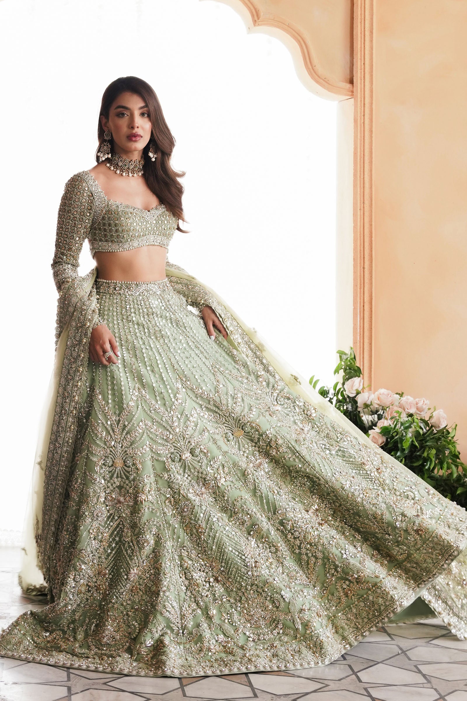 Ethereal couture fabrics for the bustier, paired with a richly embellished lehenga fabric and a lightweight dupatta, finished with a comfortable inner lining.
