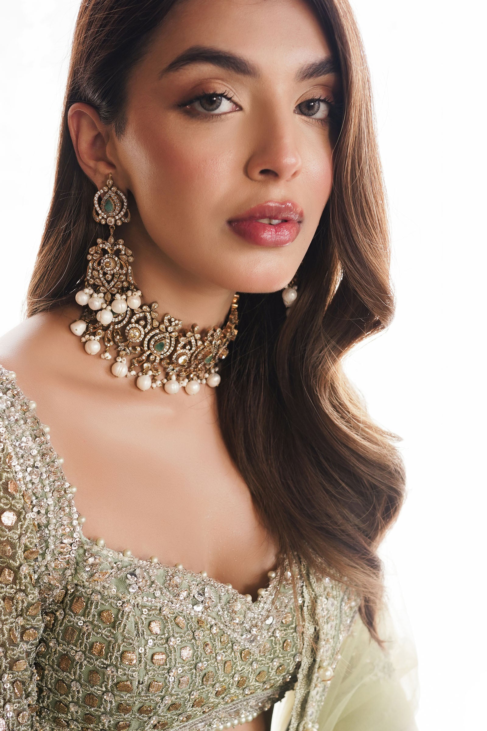 A vision of bold luxury, Salacia is an audacious couture ensemble featuring a meticulously encrusted bustier, paired with a richly adorned lehenga and an ethereal dupatta for unforgettable grandeur