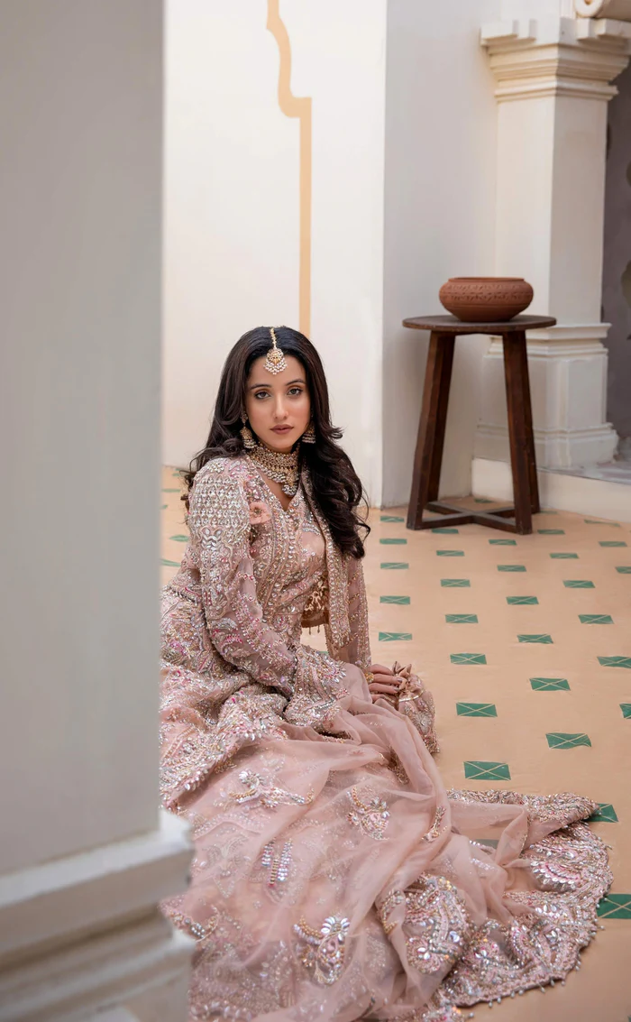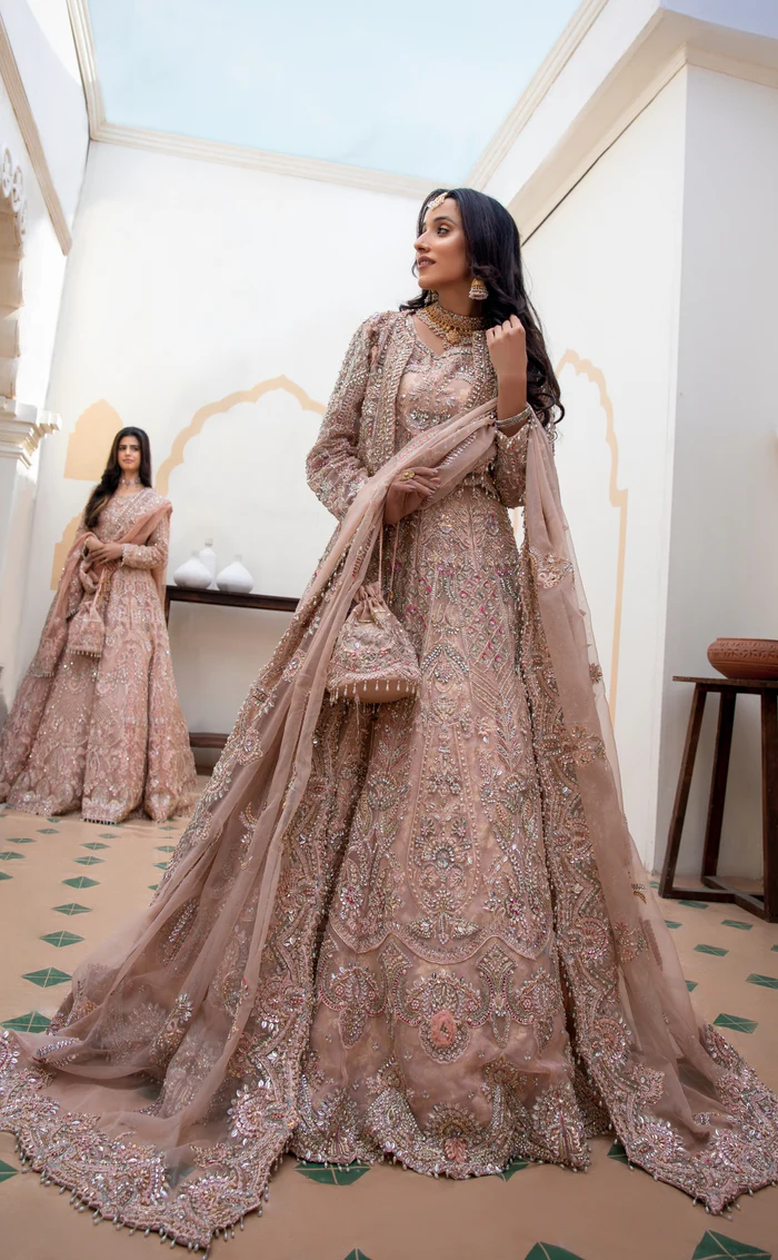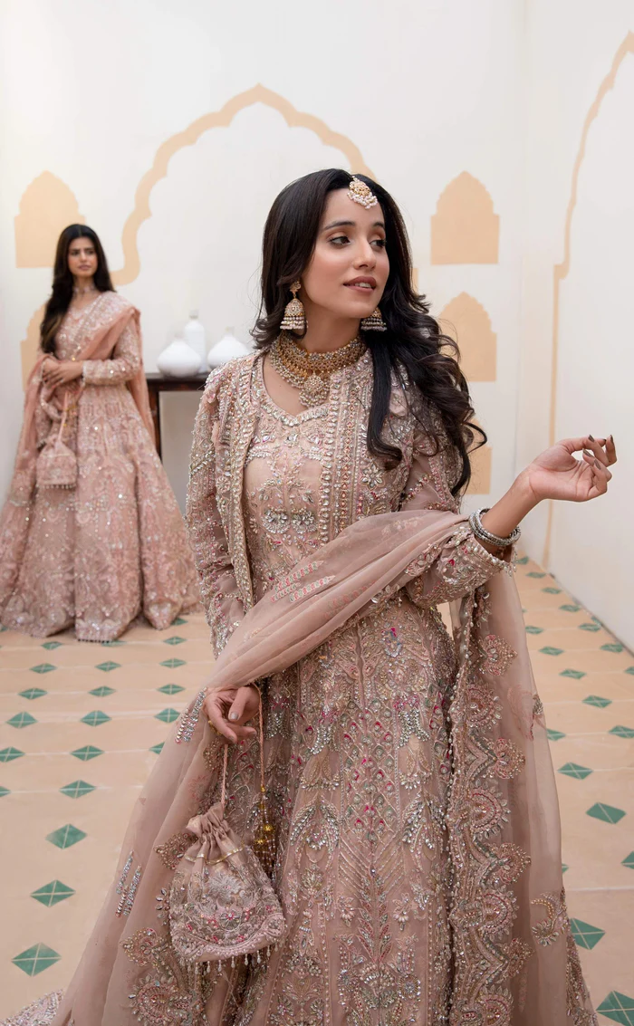 The gown and lehnga are crafted from luxurious tissue fabric, paired with a finely worked tulle dupatta that adds lightness and sophistication to the ensemble.