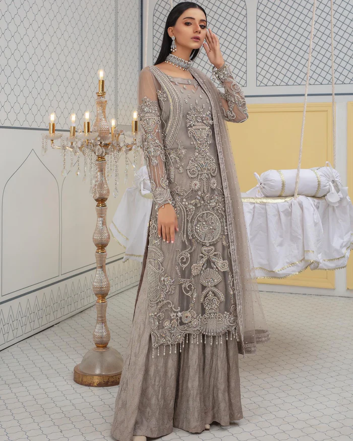 A bespoke ensemble featuring a delicately embroidered shirt, luxurious trousers, and a matching dupatta, designed for a flawless fit and timeless sophistication for bridal occasions or grand celebrations.
