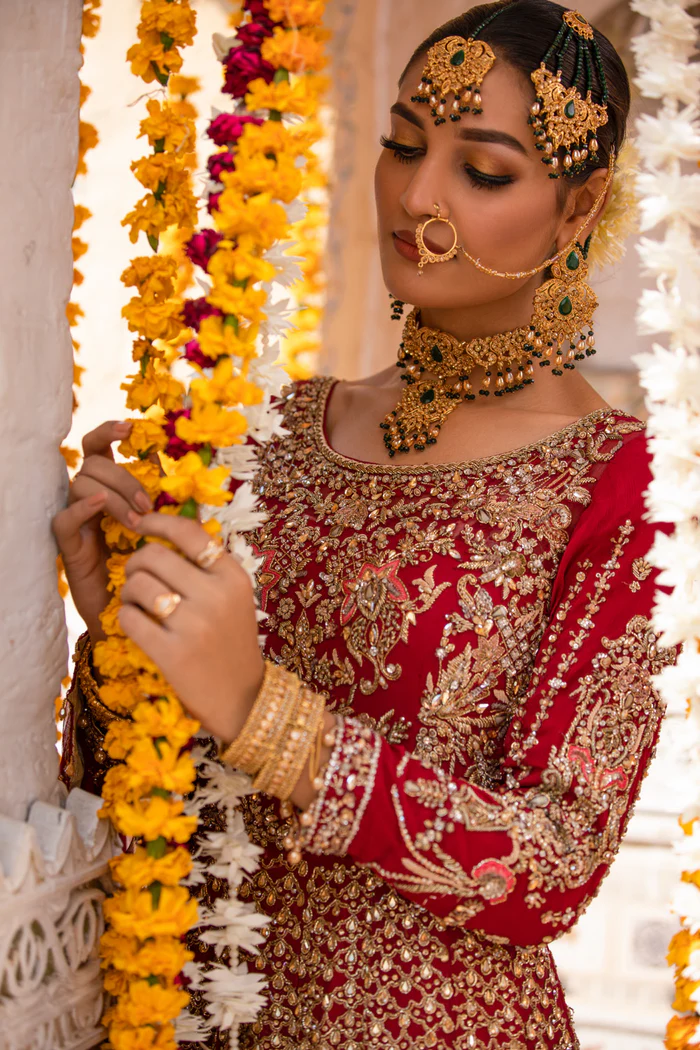 A regal deep red lehenga by Goldenzari By Shujat, featuring intricate Baroque-inspired embroidery, golden appliqué detailing, and an embellished chiffon dupatta for timeless bridal and formal elegance.