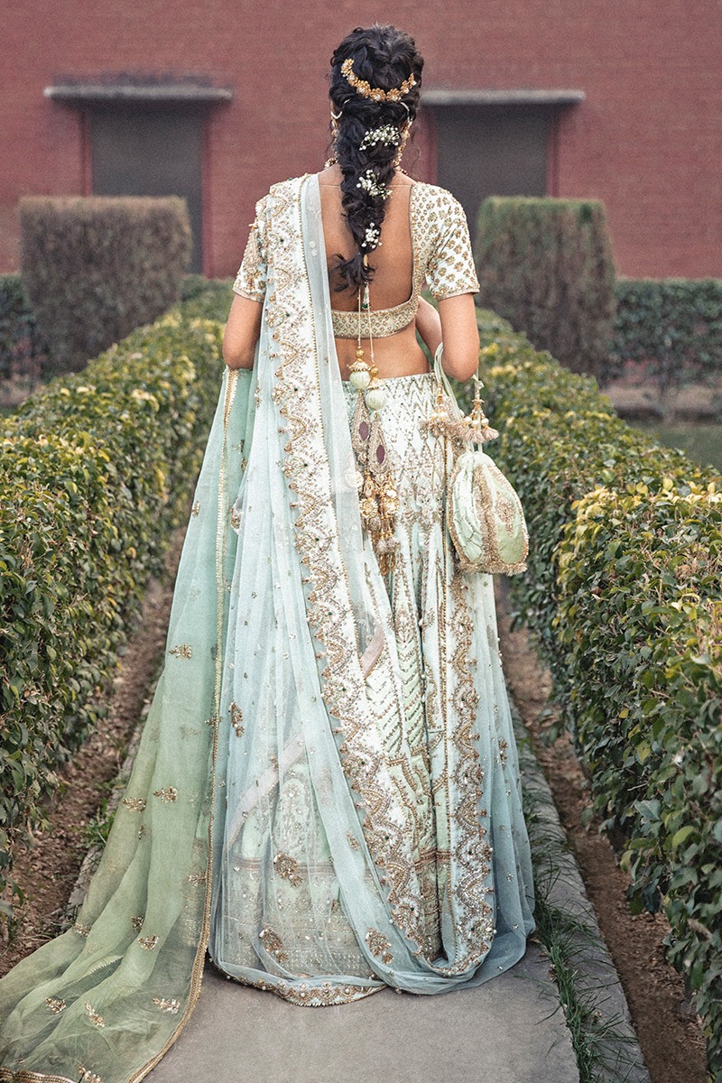 A refined five-piece bridal look in mint green, blending delicate hand embellishment, classic choli lehnga styling, and layered dupattas for a timeless yet luminous presence.