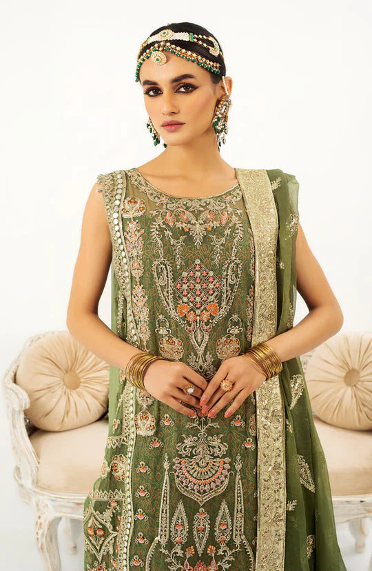 A stunning Pakistani wedding ensemble featuring a premium green chiffon kameez with intricate embroidery, paired with a lavish sharara and a delicate embroidered dupatta. Perfect for Mehndi, wedding functions, or festive occasions.