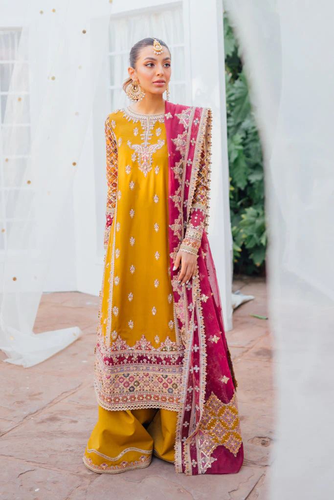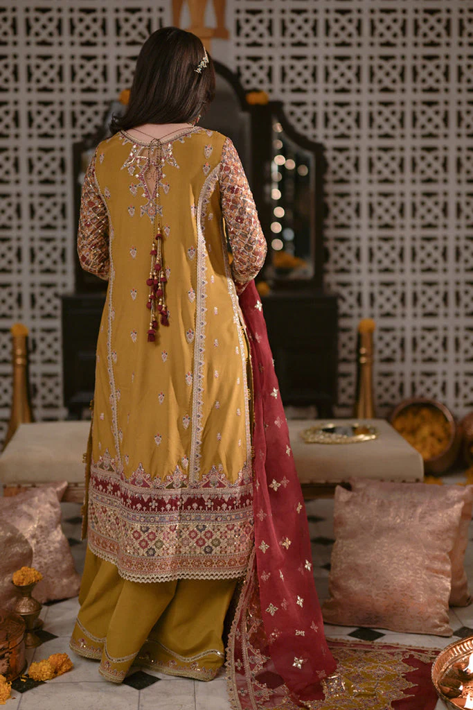 The stunning mustard yellow kameez is crafted from premium raw silk and adorned with intricate embroidery, tilla, and gota work. Embellished borders and delicately worked sleeves enhance the royal charm of this traditional attire, making it perfect for Mehndi or wedding events.