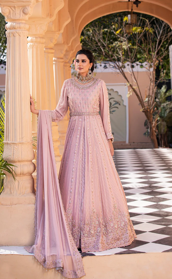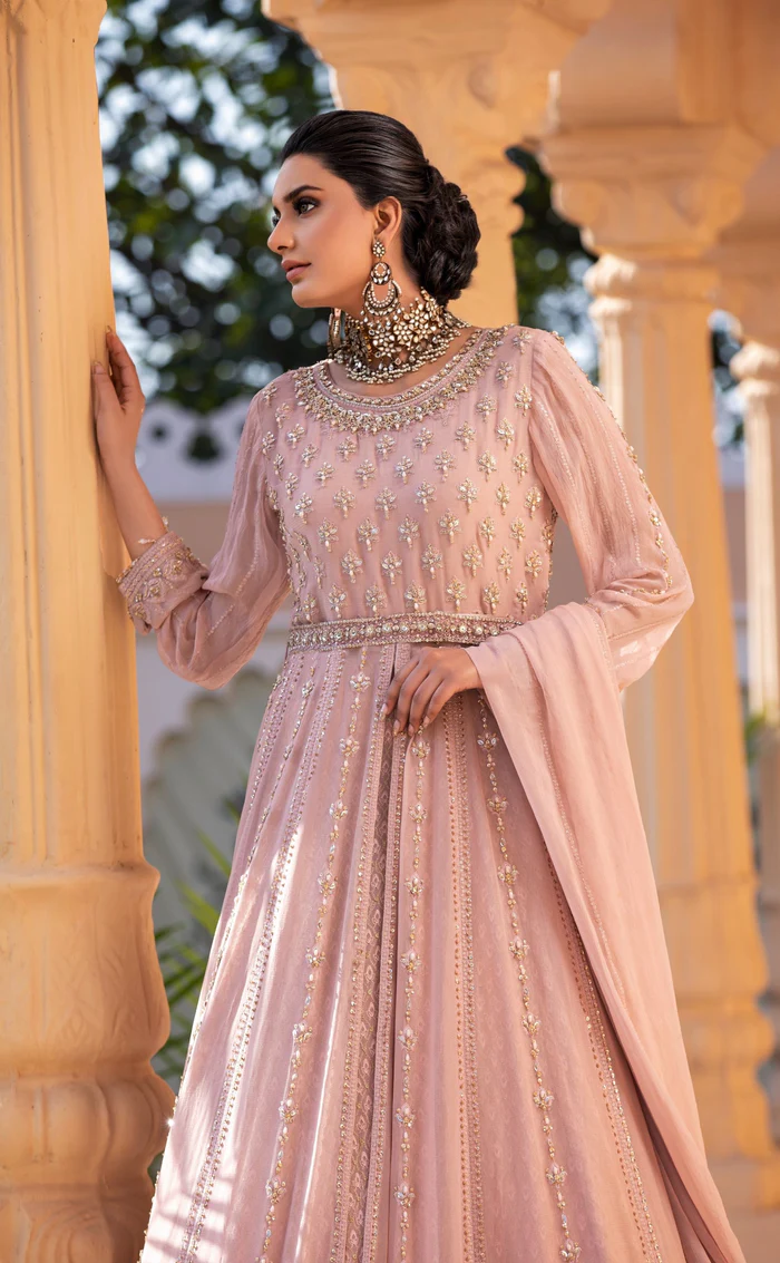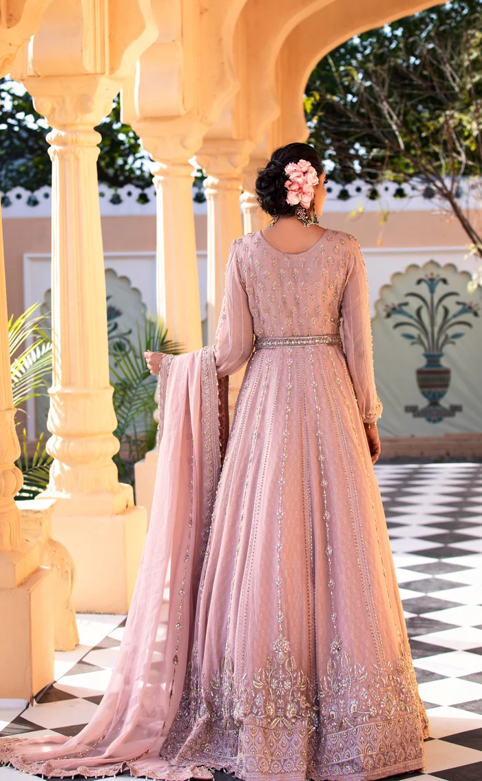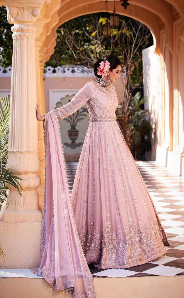 The lehenga skirt is made from flowing pink chiffon, meticulously decorated with matching hand embroidery throughout. The carefully crafted detailing enhances the skirt’s volume and movement, creating a graceful, statement-making ensemble.