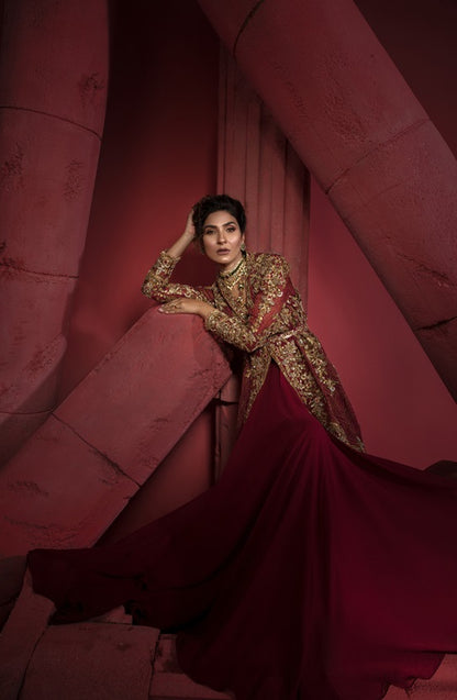 The accompanying jacket is richly embroidered with traditional motifs, highlighting intricate thread work and detailing. It provides a statement layer that adds depth, elegance, and cultural charm to the ensemble.