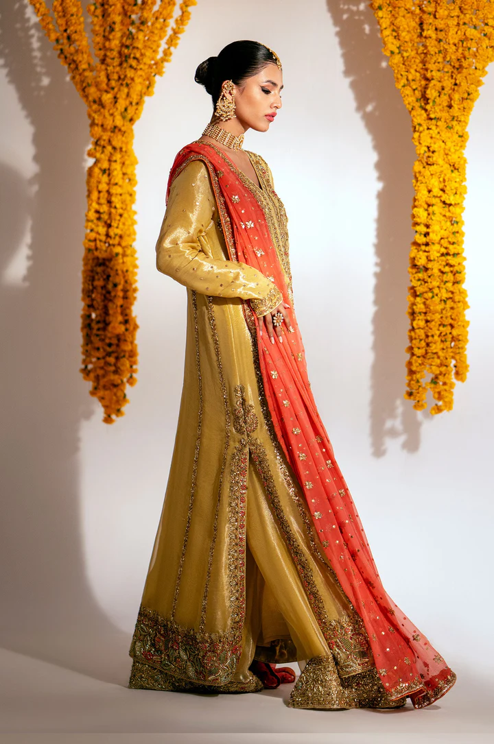 The ensemble is completed with a peach chiffon dupatta, embellished with goldwork, tilla, and gota accents. The delicate embroidery and shimmering details create a graceful drape, providing the perfect finishing touch for a vibrant Mehndi look.