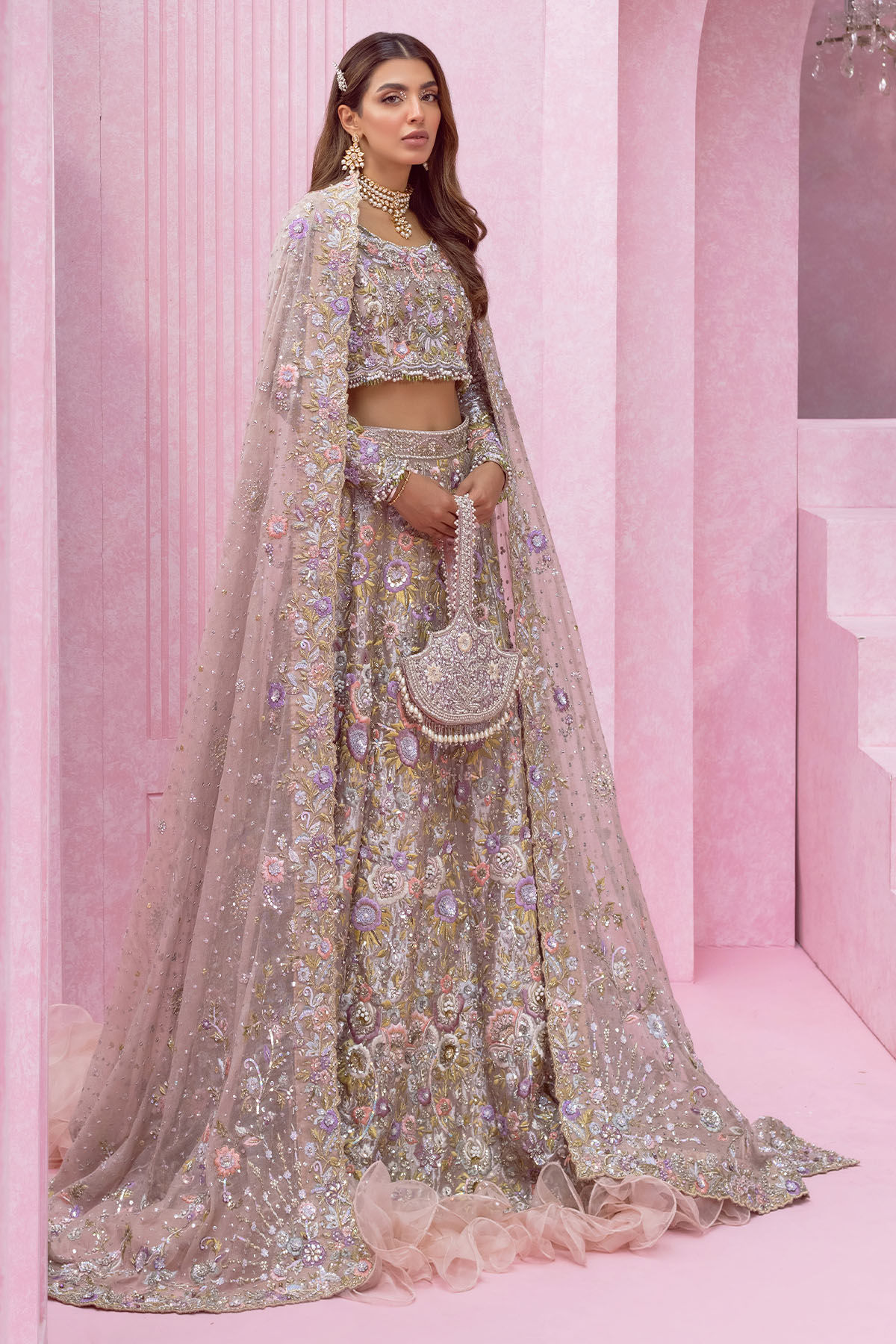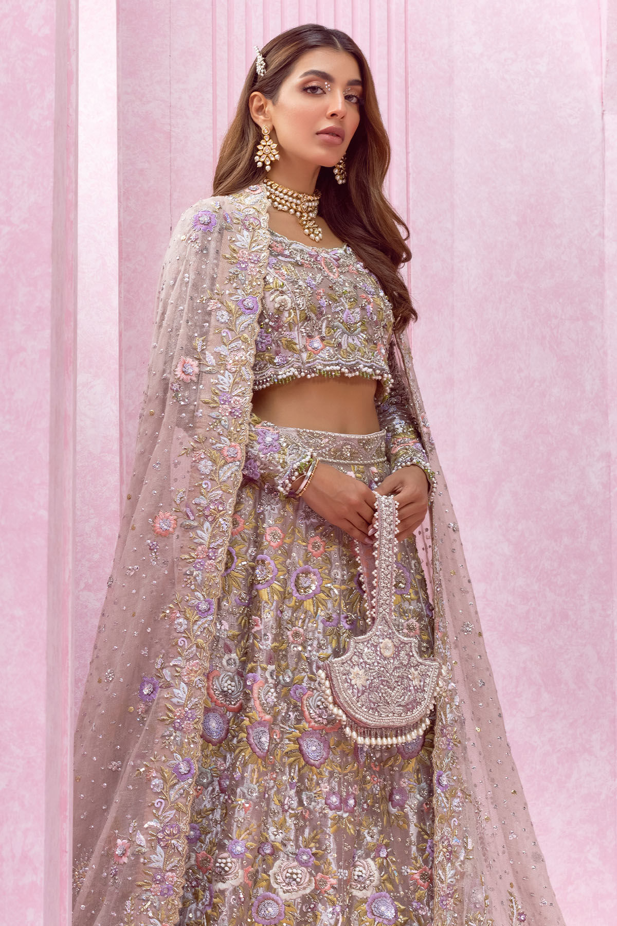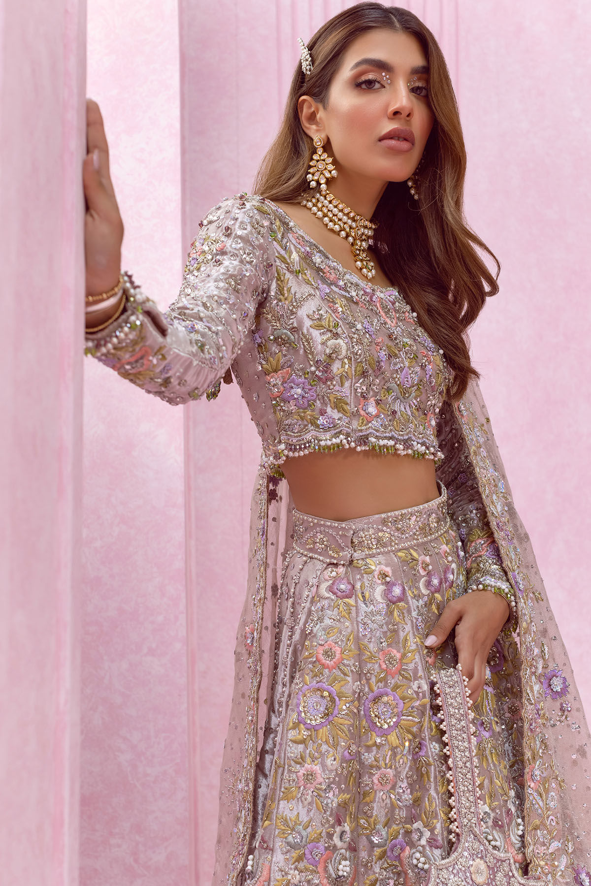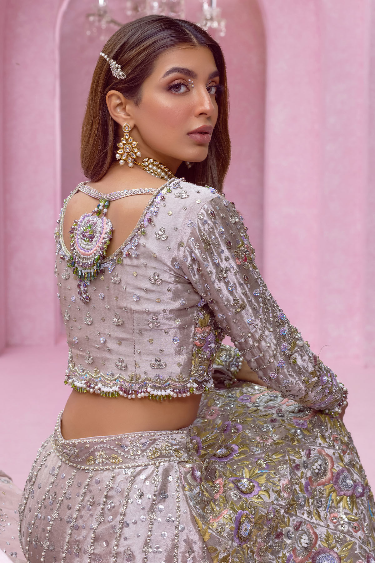 The lehnga is a true statement piece, composed on a matching nude gold canvas. Symmetrical floral patterns bloom across the surface in soft pastel hues, enhanced with hand-applied zardozi and crystal embellishment. The balance of shimmer and color gives the lehnga depth, elegance, and graceful movement.