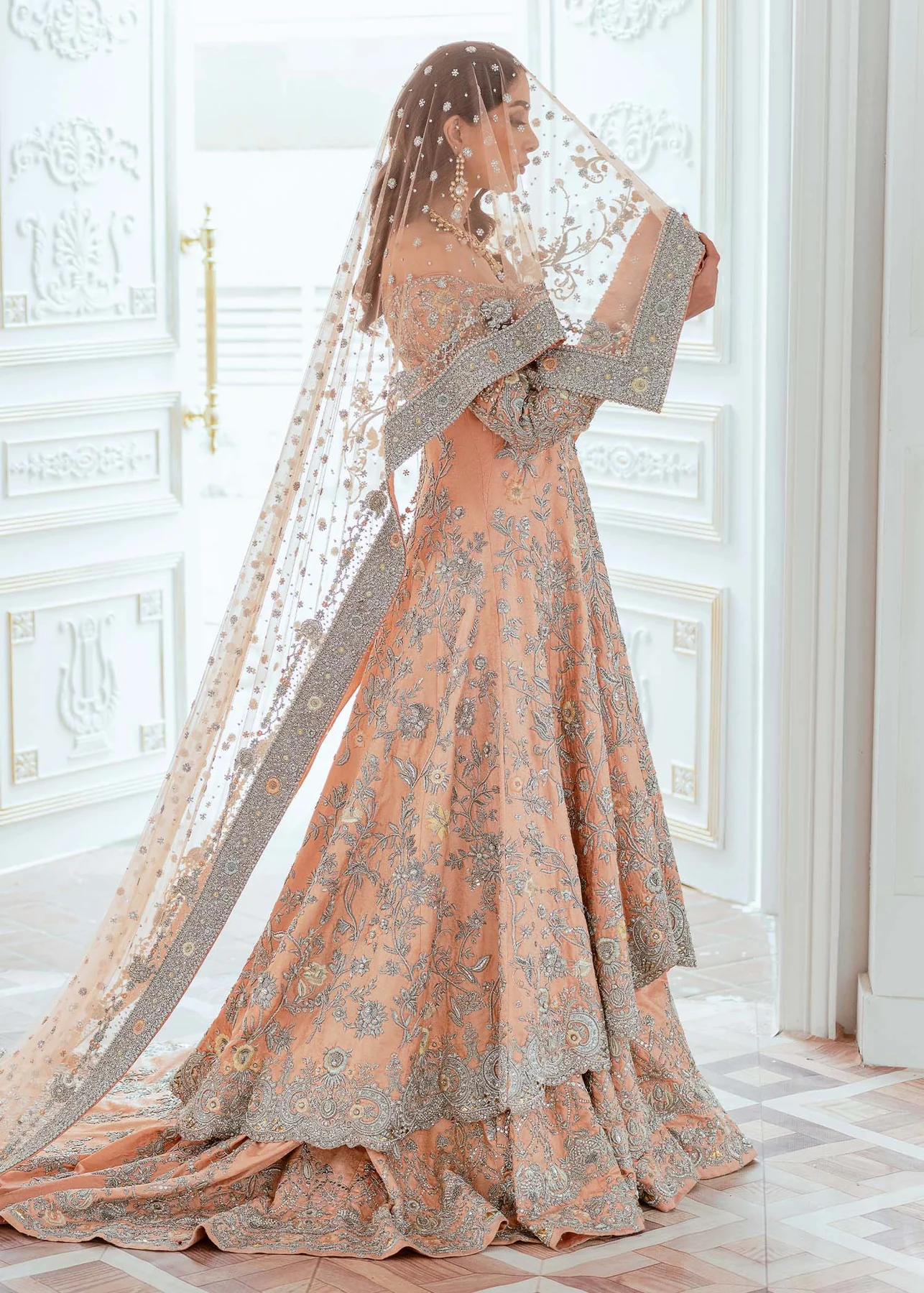 Premium net fabric for the veil, paired with a finely constructed base for the embellished maxi.