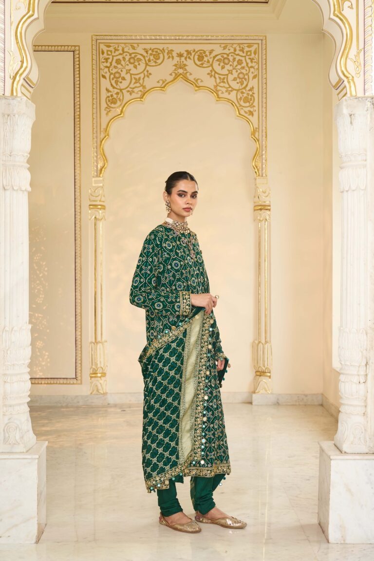The long kurta is crafted in a rich green bandhani base, enhanced with refined handwork that includes mirror accents, cutdana detailing, and multi-toned thread artistry. Its structured silhouette maintains traditional grace while embracing a modern handcrafted elegance. Each embellishment is thoughtfully arranged to highlight the intricate texture of the bandhani pattern.