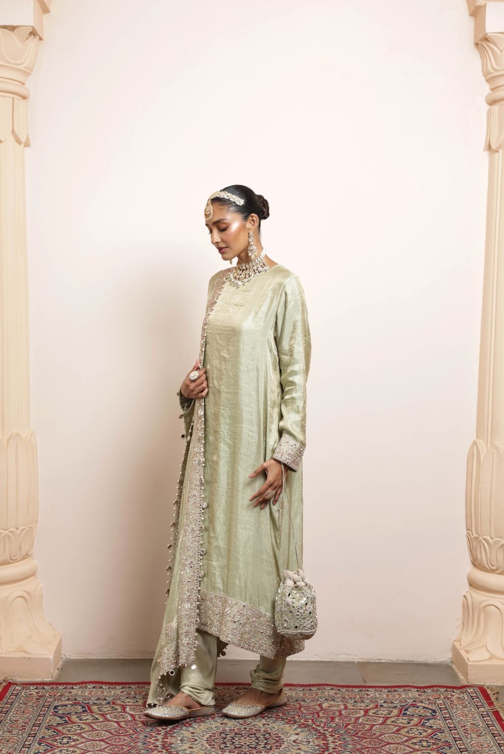 The kurta is crafted from premium tissue fabric in a soothing sea green hue. Intricate hand embroidery incorporates rose gold sequins, mirror accents, and cutdana detailing to create a delicate, shimmering effect. The long silhouette is designed to enhance elegance and grace for ceremonial occasions.
