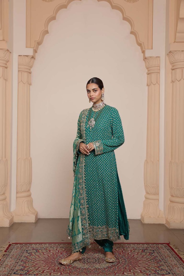 The long kurta is crafted in a rich green shade and elevated with meticulously placed mirror accents and cutdana detailing. The hand-embroidered artwork adds depth and luminosity, creating a refined festive and wedding-ready silhouette. Its straight structure allows the embellishment to shine while maintaining comfort and elegance.