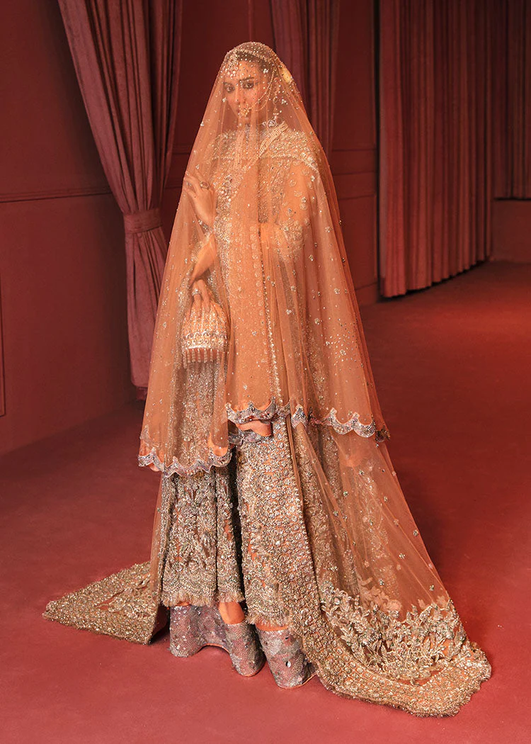 The lehenga complements the peshwas with its refined peach base, adorned with a delicate sequin booti chatta spread evenly across the fabric. The subtle sparkle adds movement and visual harmony while maintaining a balanced and graceful aesthetic. Designed to flare beautifully, the lehenga enhances the overall silhouette of the ensemble.