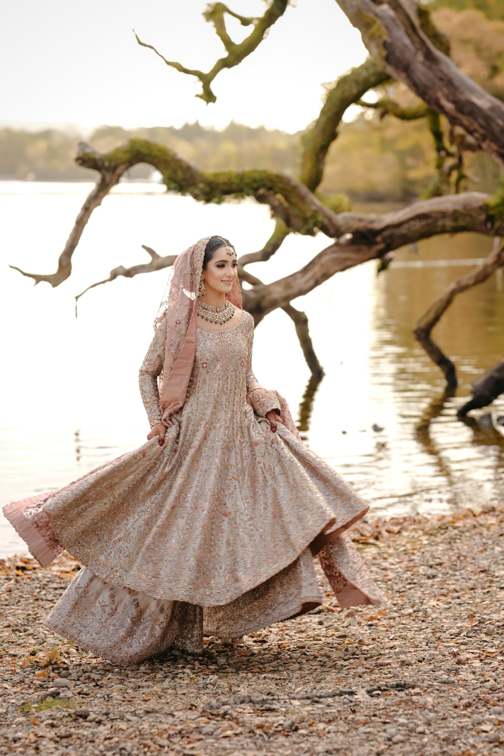 A majestic Pakistani bridal ensemble featuring a long, heavily embroidered dusty rose shirt paired with a voluminous, layered skirt/gharara in complementary blush tones, and a soft net dupatta finished with opulent gold work.