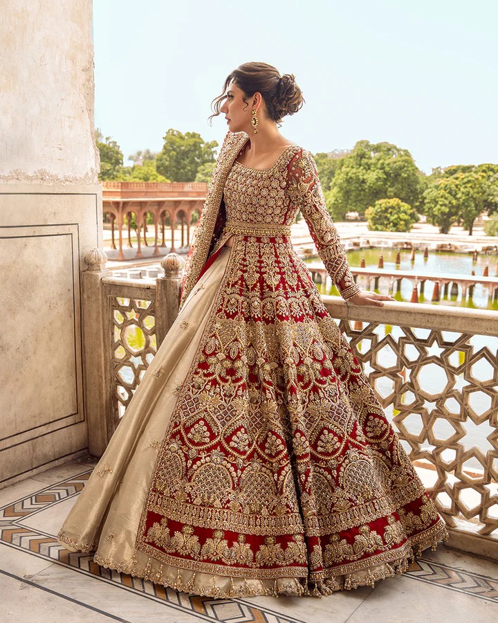 Paired with the gown is a tissue lehenga that carries a gentle sheen and fluid movement. The lehenga is fully embellished by hand, enhancing its luxurious finish. Its shape supports the gown’s regal presence while offering a balanced, harmonious silhouette suitable for formal occasions.