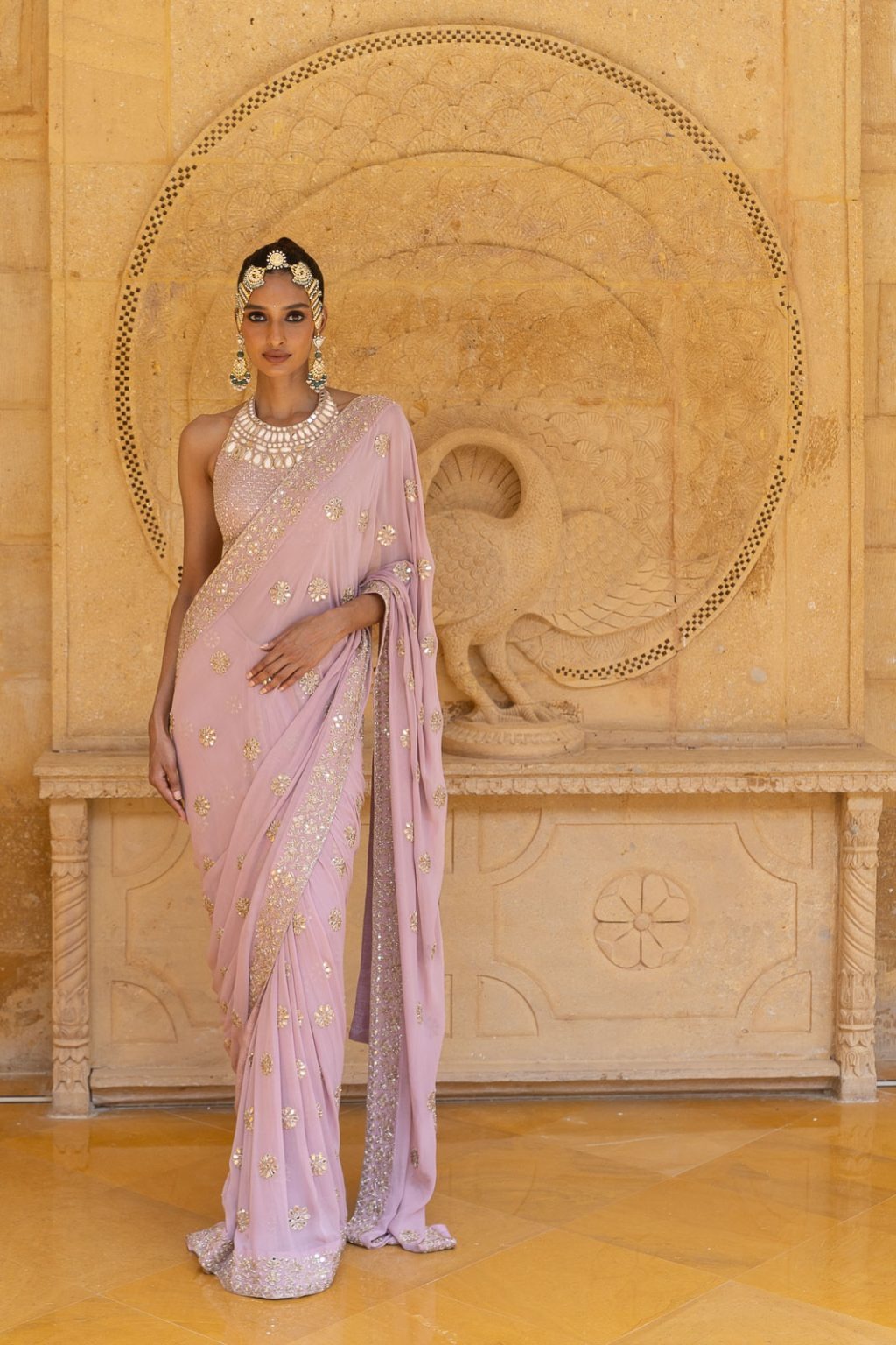Hand-done embellishment featuring a blend of sequins, beads, stones, silk threads, and fine detailing placed to elevate the outfit’s visual richness and refinement.
