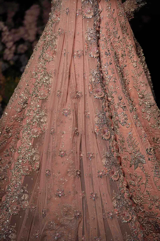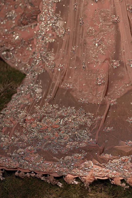 The lehenga is tailored from matching blush katan silk and flows into a dramatic, voluminous flare. Its surface is richly covered with detailed handcrafted embellishment, featuring floral and vine-inspired motifs enhanced with sequins and cut-glass accents. The dense embroidery along the hem adds grandeur, while the subtle shimmer throughout the fabric creates graceful movement with every step. Fully lined for comfort, the lehenga offers a regal yet effortless bridal silhouette.