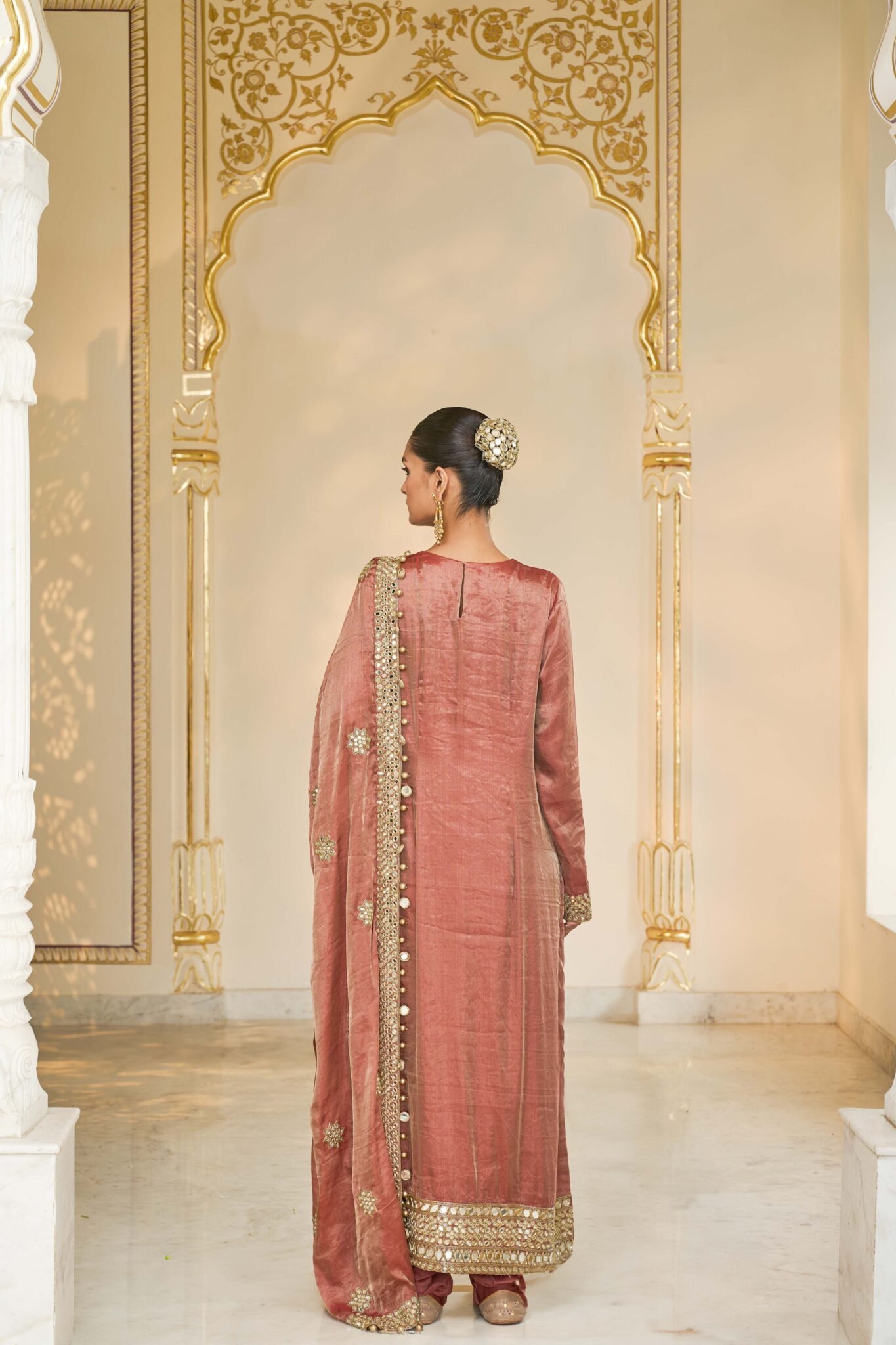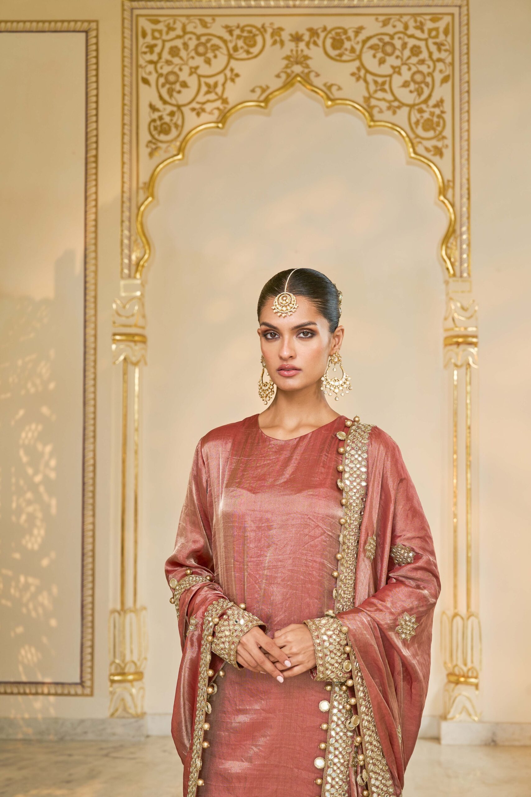 A delicately hand-embroidered tissue kurta paired with a classic churidar and a beautifully detailed dupatta, designed in graceful brick and beige-gold tones for timeless elegance.