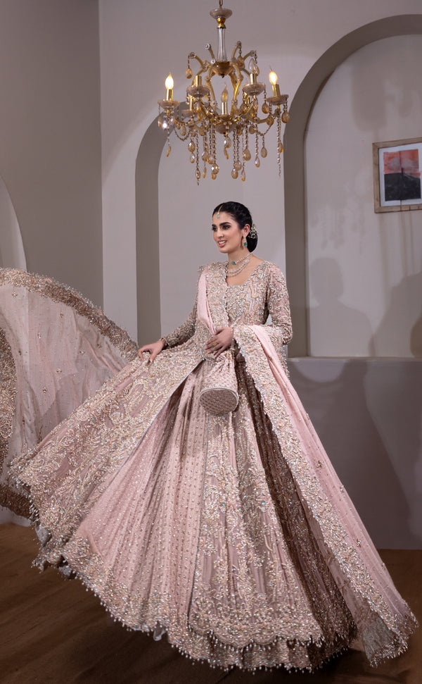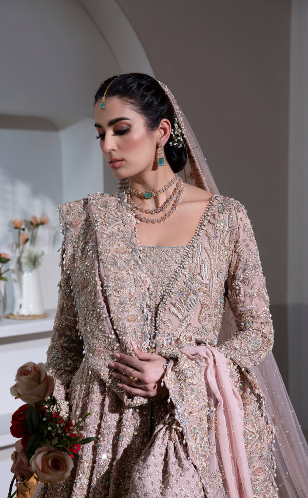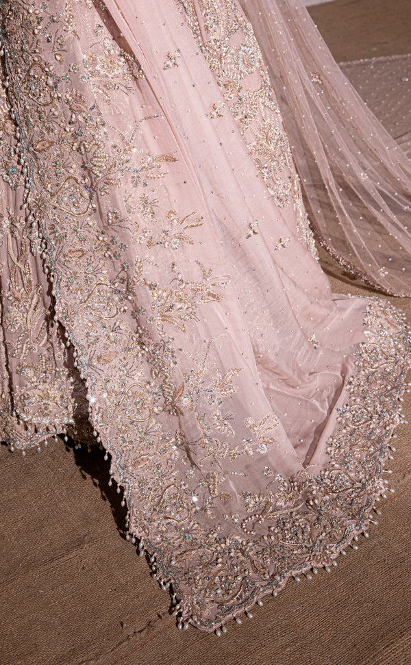 The dupatta completes the ensemble with its light, ethereal drape and thoughtfully embellished accents. Designed to frame the outfit beautifully, it carries subtle touches that elevate the bridal look while maintaining softness and harmony throughout.