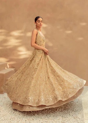 The lehenga is crafted in a rich golden base, flowing into a voluminous floor-length silhouette that exudes effortless luxury. Intricate embroidery, shimmering sequins, and ornate motifs are spread harmoniously across the panels, creating depth and movement. The hemline is finished with heavier embellishment, enhancing the regal presence of the design. Fully lined for structure and comfort, the lehenga moves gracefully with every step.